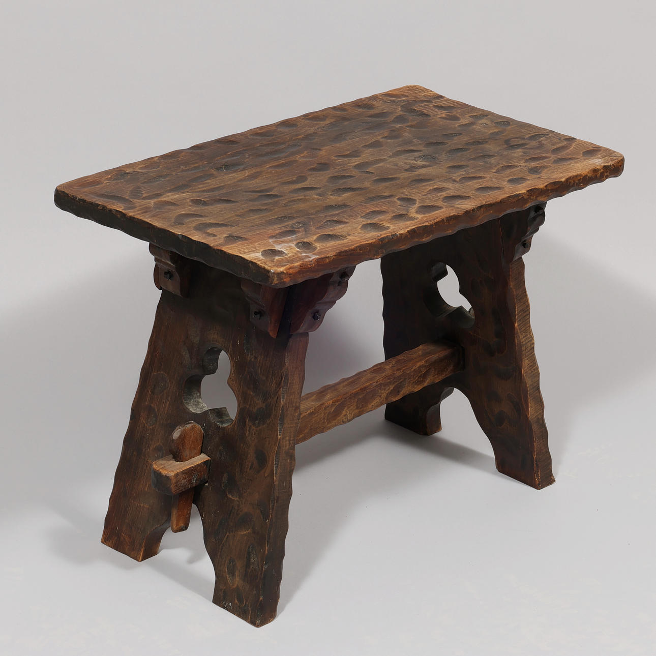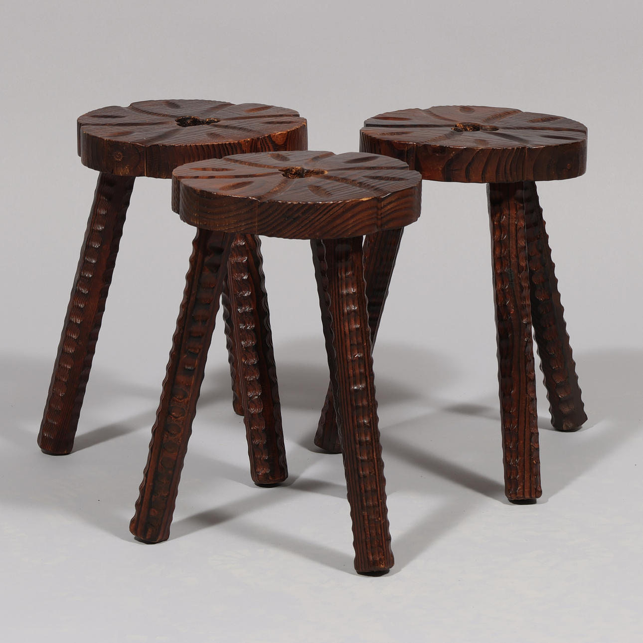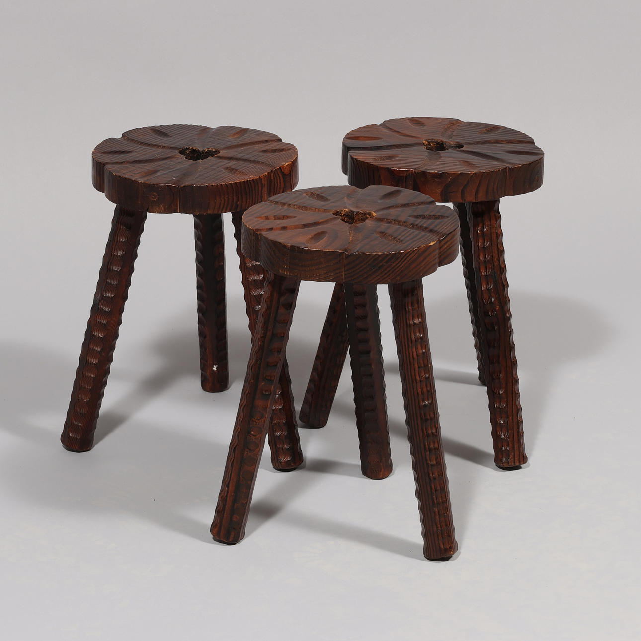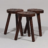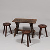Soffbord och tre pallar av färgat trä med sniderier. Mål: Tabell: h. 50, l. 70 x b. 39 cm. Stolar: h. 37, Ø. ca 24,5 cm.