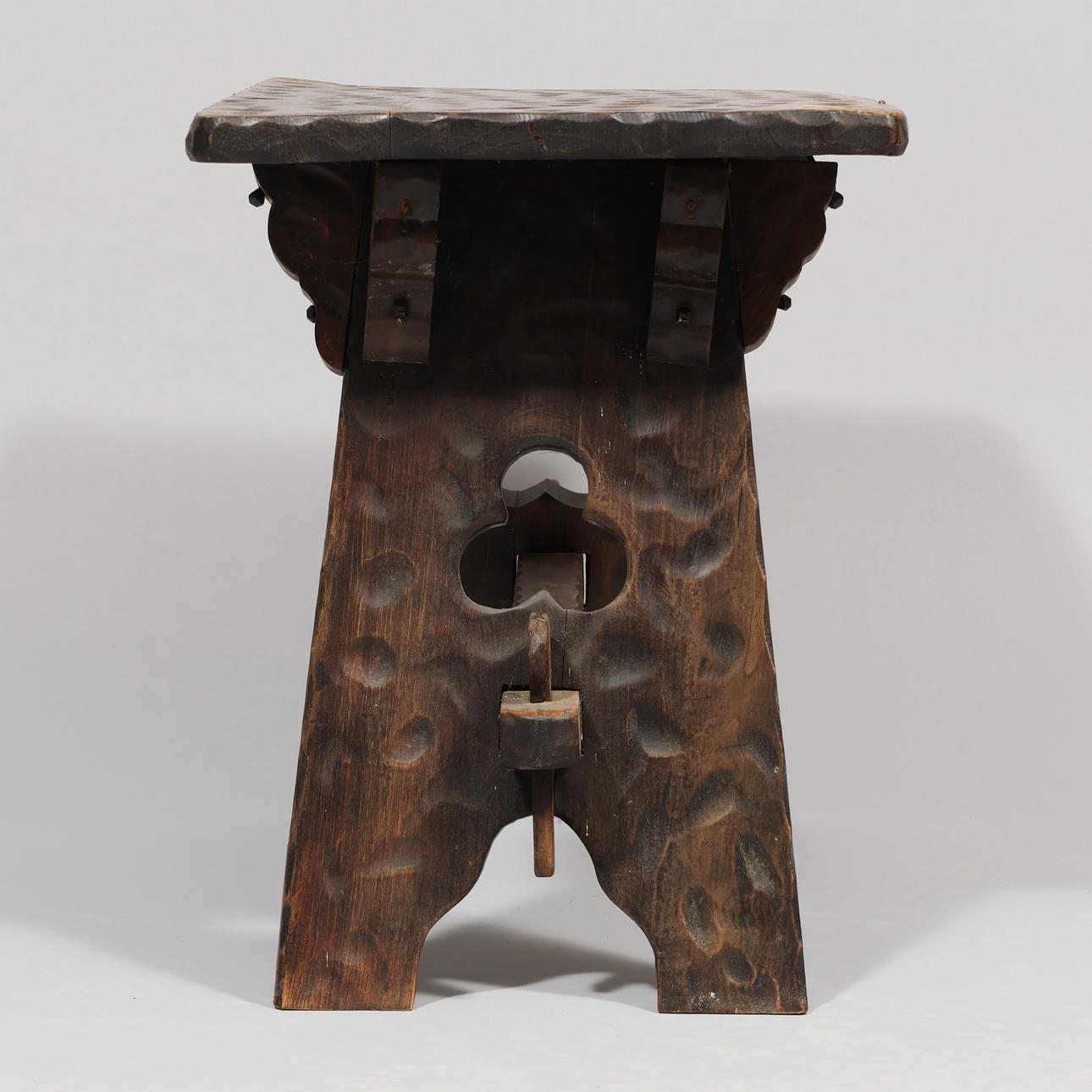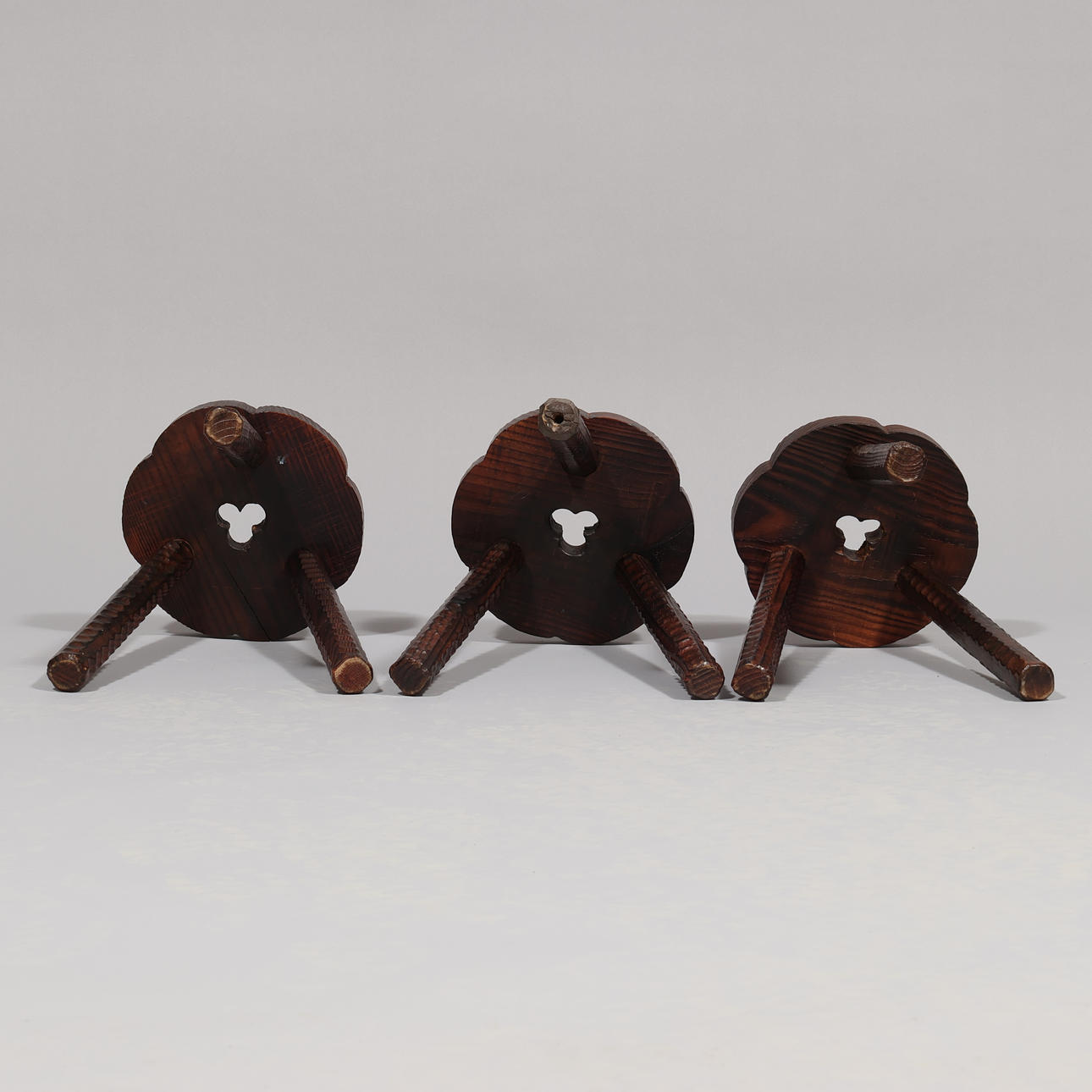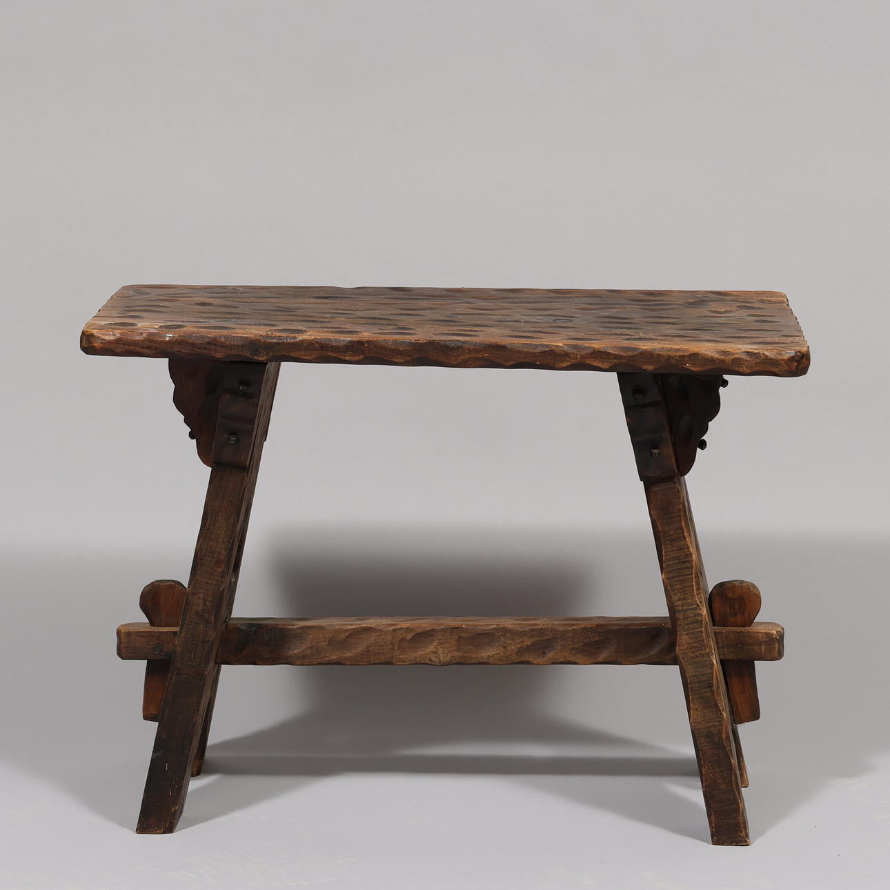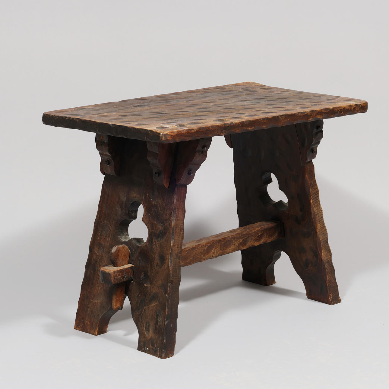Soffbord och tre pallar av färgat trä med sniderier. Mål: Tabell: h. 50, l. 70 x b. 39 cm. Stolar: h. 37, Ø. ca 24,5 cm.