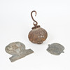 Plack i form av ett brandmärke för Salop Fire Office nummer 5266 (19cm x 18cm) och Apollo (14cm x 14cm), tillsammans med en tung järnklumpvikt. (3).