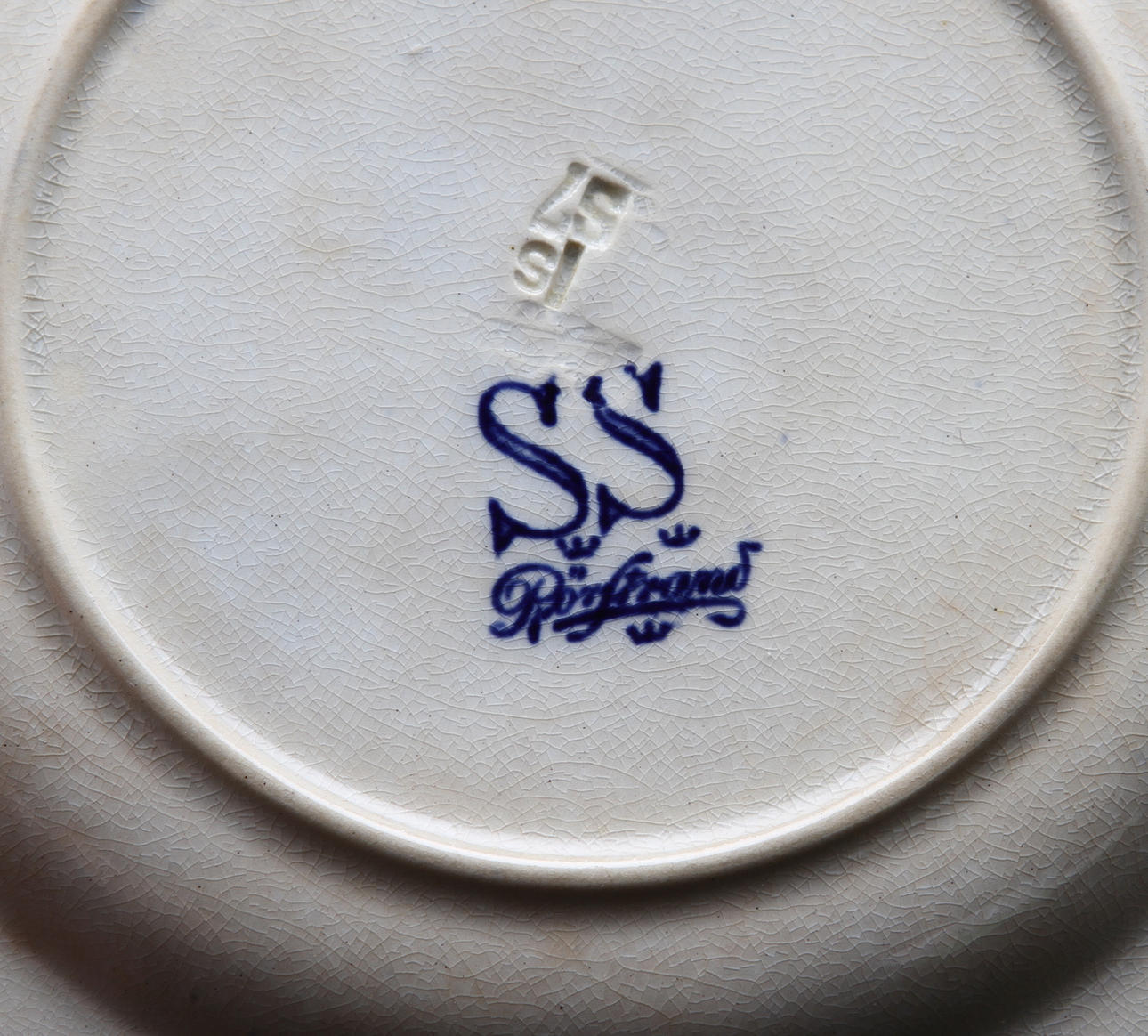 Spricka samt lagning i ett av uppläggningsfaten Omfattande glasyrdefekter samt fläckar. Nagg, sprickor samt bruksslitage. Glasyrkrackelering.
