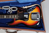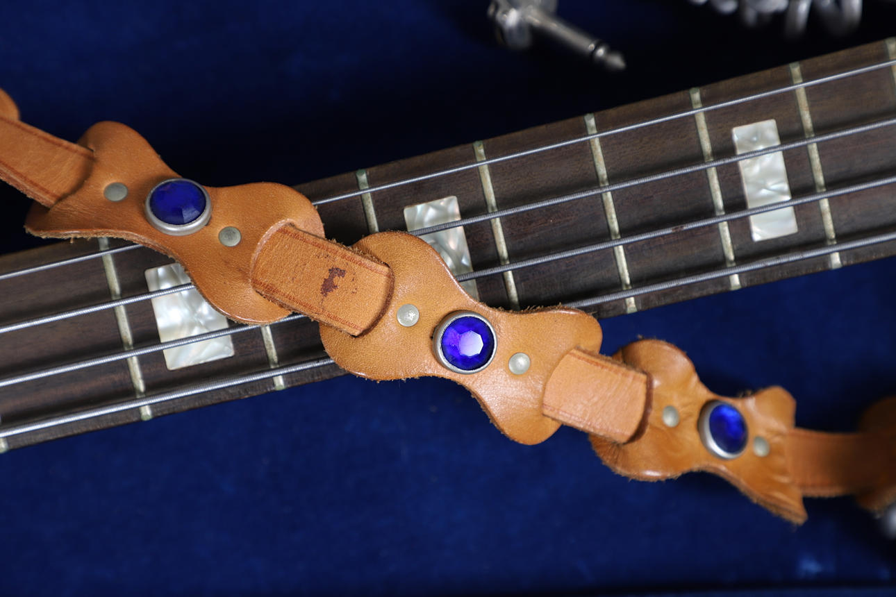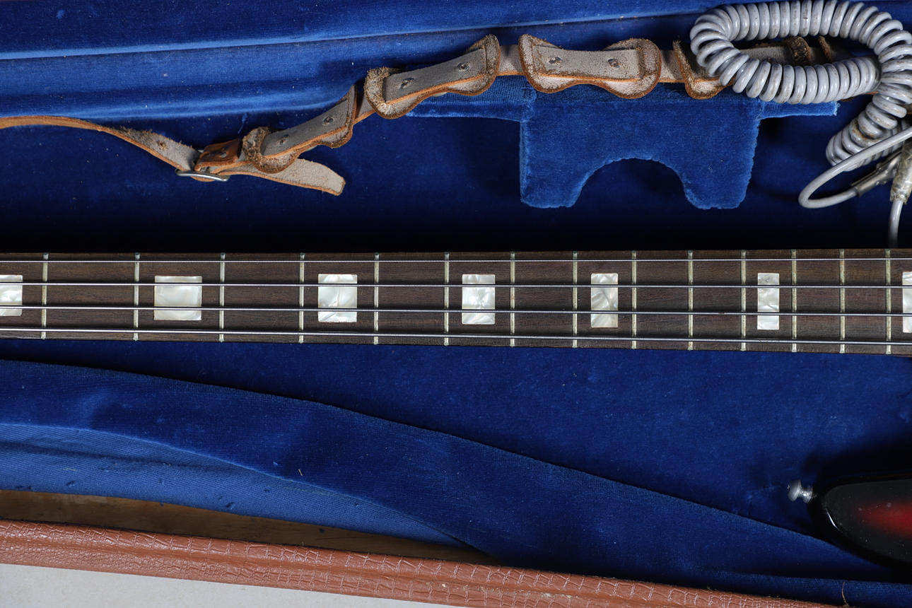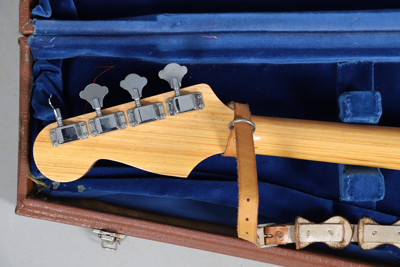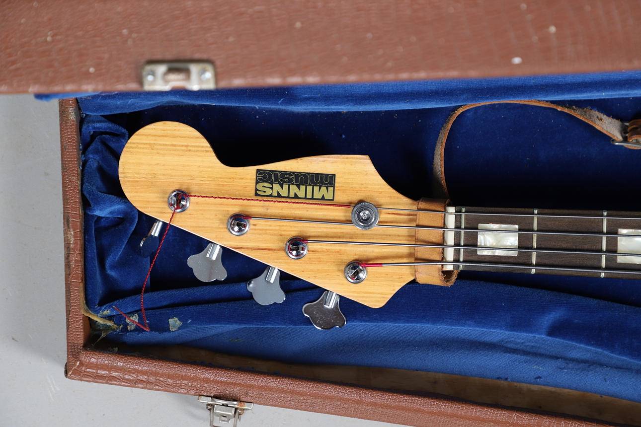 En japansk tillverkad basgitarr, säljs av Minns Music och i ett vintage gitarrfodral. Märkt ”Made in Japan” på halsen, 115 cm lång, fodral 122 cm lång