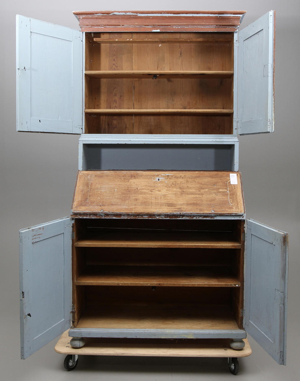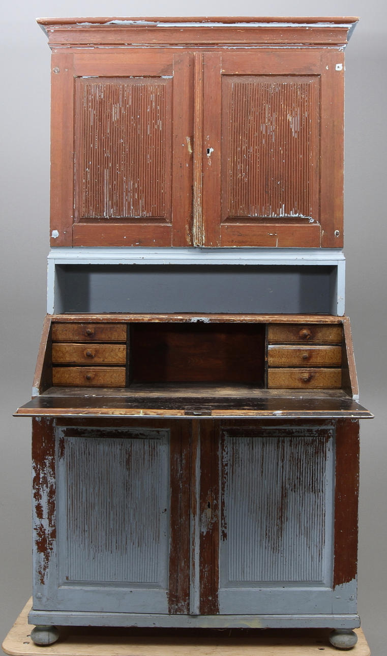 Räfflade dörrar. Inrede med hyllor och lådor. Utfällbar skrivskiva.