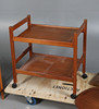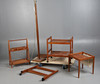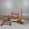 Med slitage och märken som står i proportion till ålder är lampan otestad och säljs som utställningsartikel, en vagn saknar topp/brickor, sidobordet har några lösa fogar, några snygga bitar.