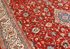 Huvudfält med röd bottenfärg, mittmedaljong samt hörnornament. Huvudfältet har också dekor av palmett- och arabeskranka. Huvudbård med ljus bottenfärg samt palmett- och arabeskranka.