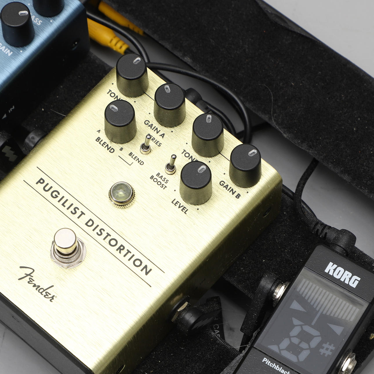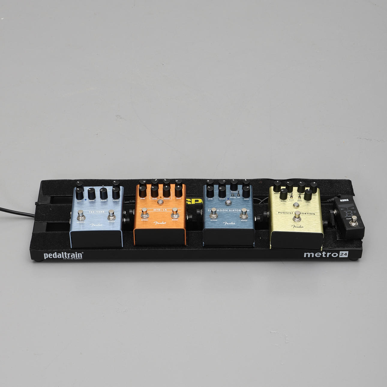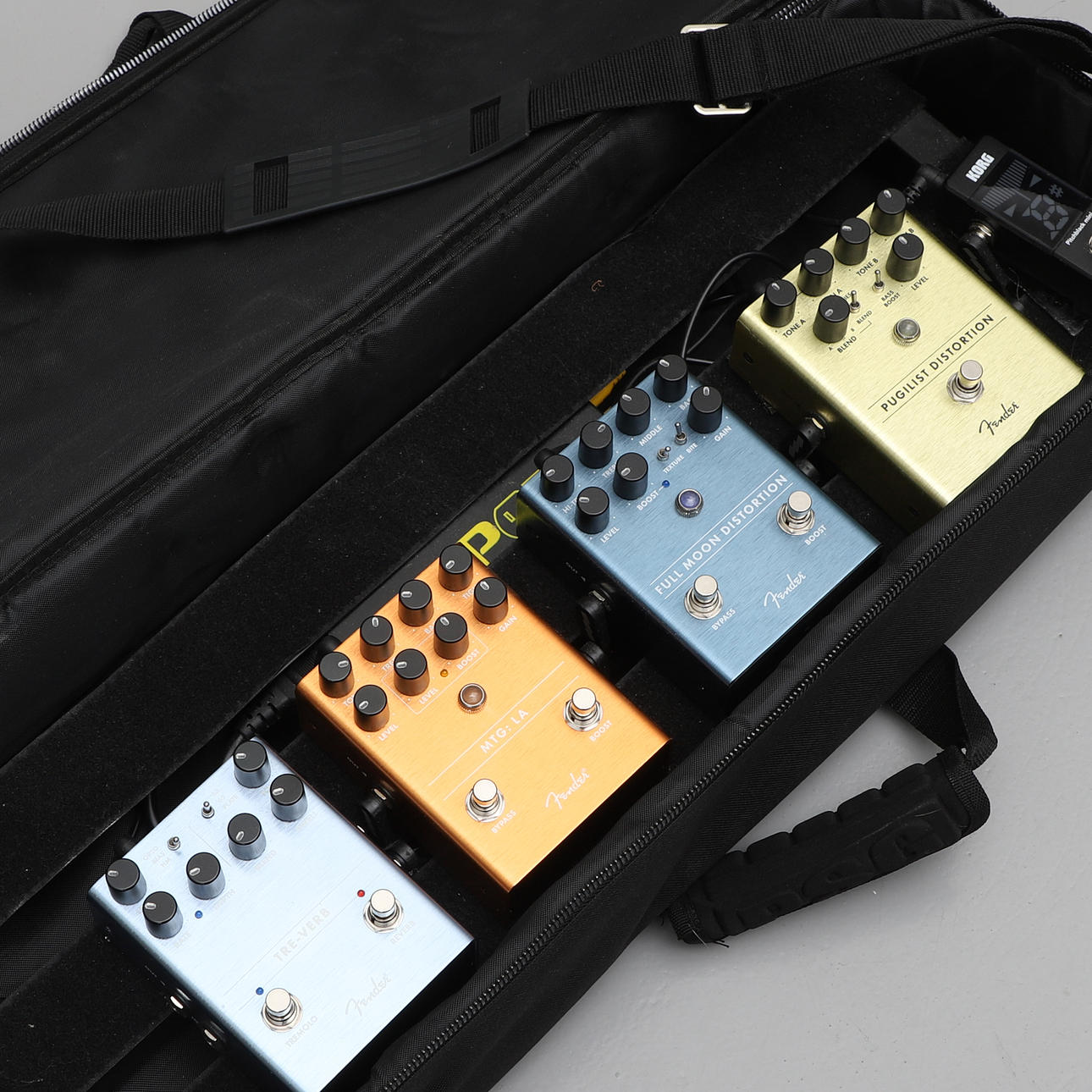 Fender: Tre-verb, MTG:LA, Full Moon Distortion samt Pugilist Distortion. Samt Korg Pitchblack mini tuner. Pedalbord Pedaltrain i väska. Nätkabel medföljer. Väska 25 x 66 x 12 cm.
