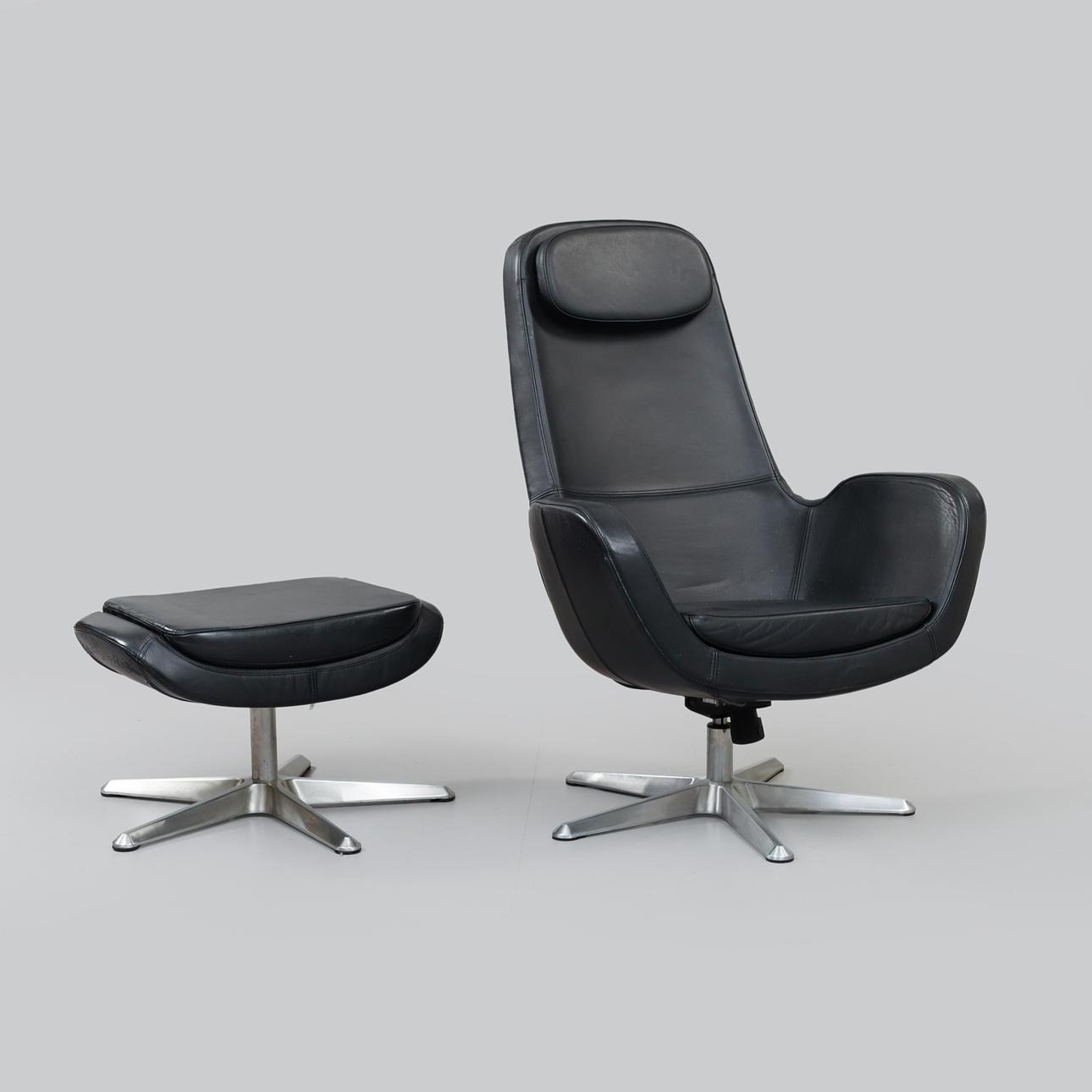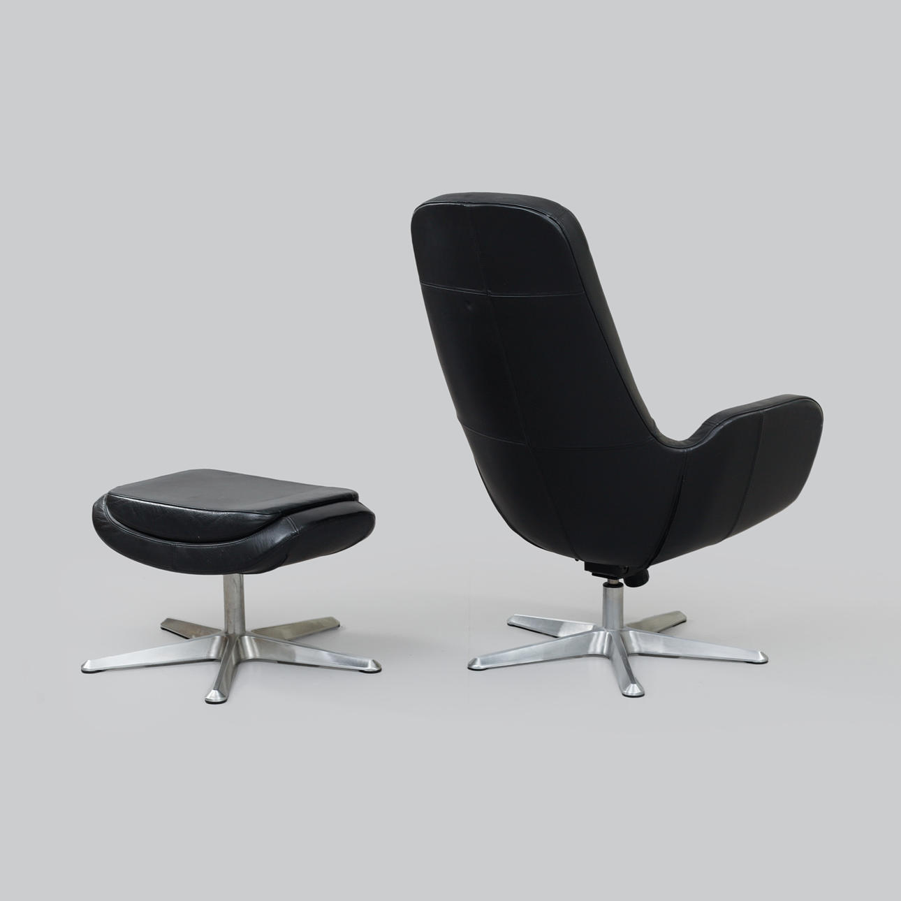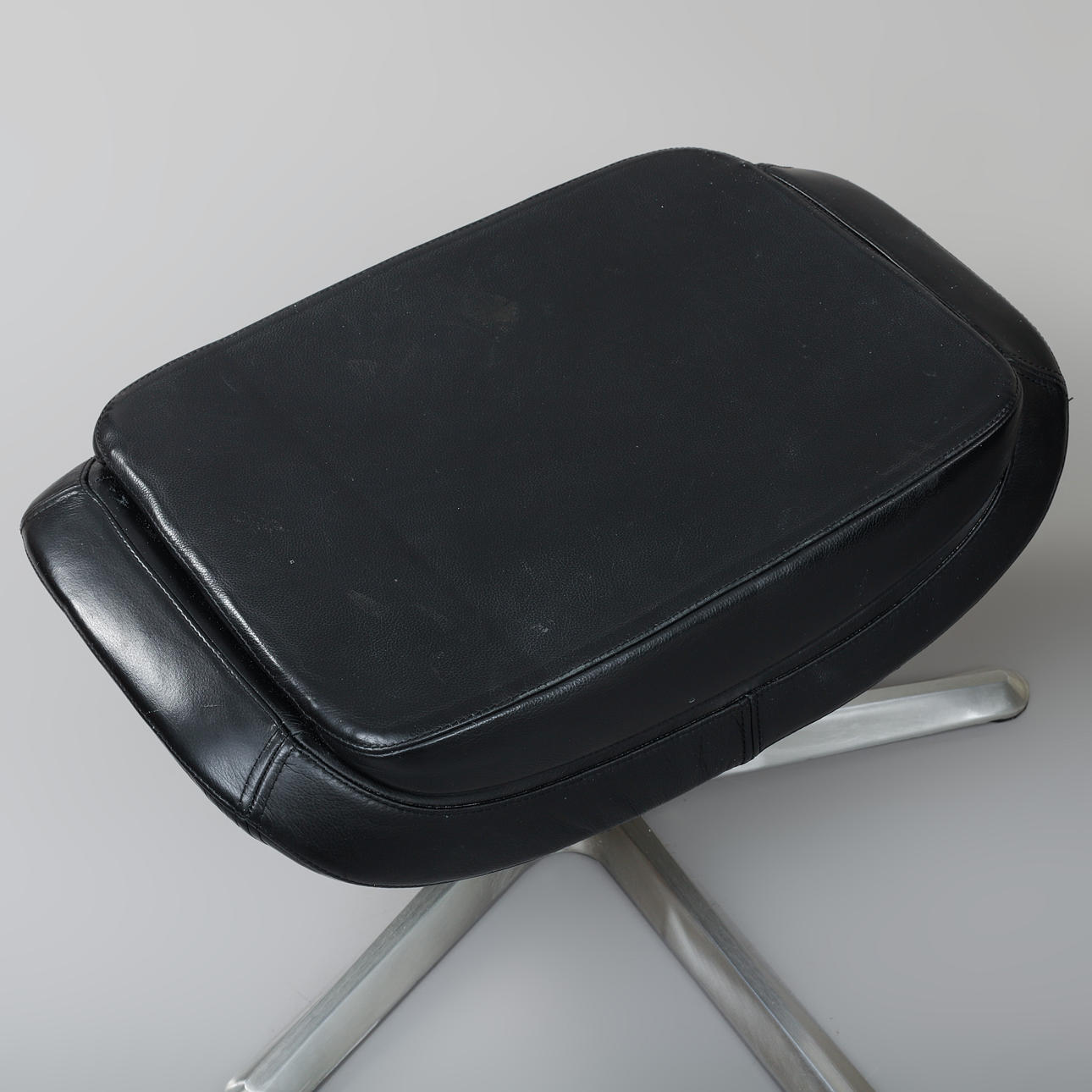 Snurrbar. Lös plymå i sits. Med fotpall. Svart skinnklädsel. Sitthöjd 40 cm. Rygghöjd 110 cm.
