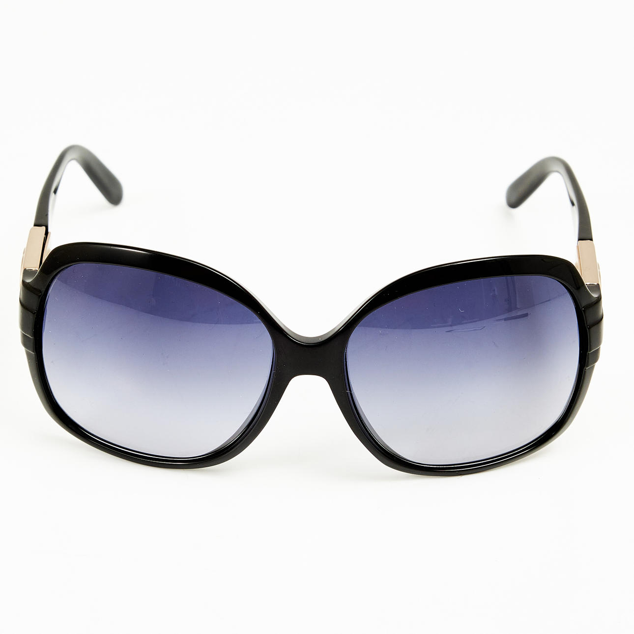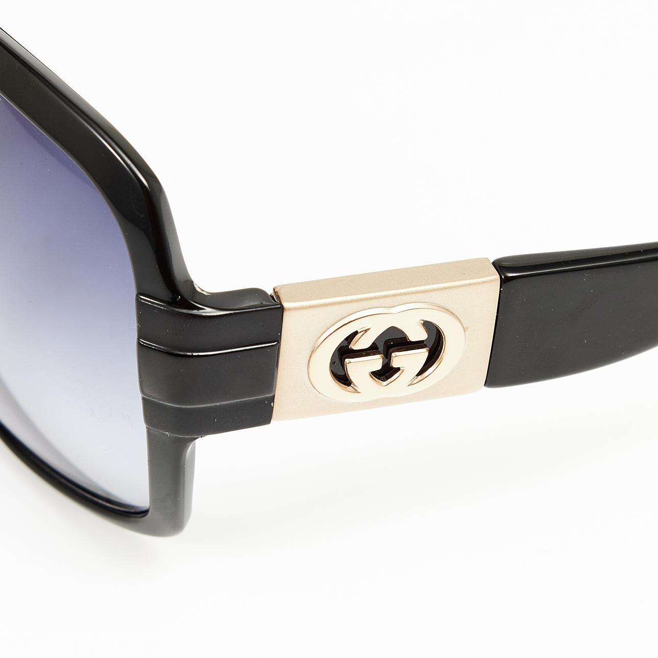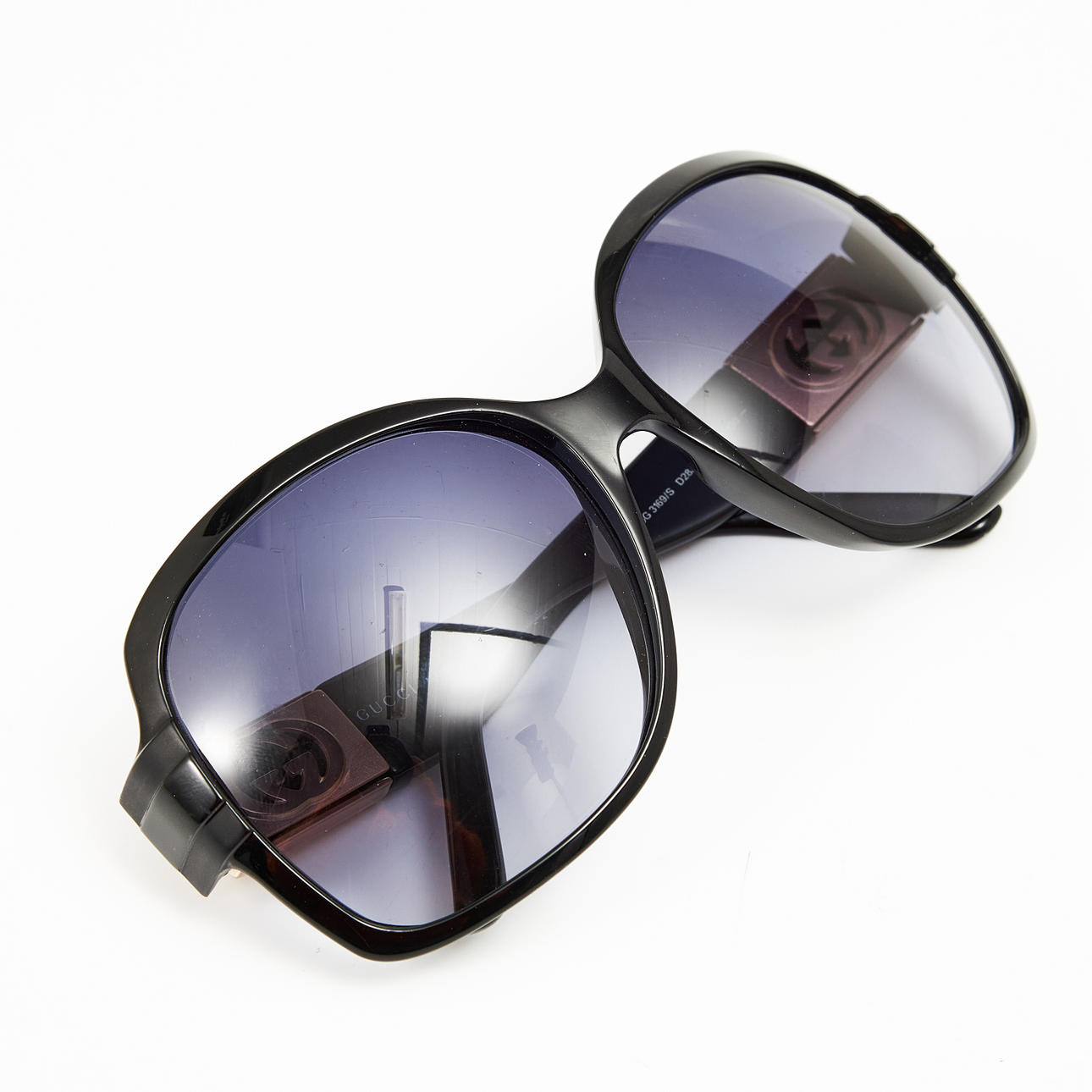 Mörktonade glas i svartlila, bågar och skalmar i svart med monogram i gulmetall, modell GG 3169/S D28JJ 59 16 130, bredd ca 14.5, höjd 6cm.