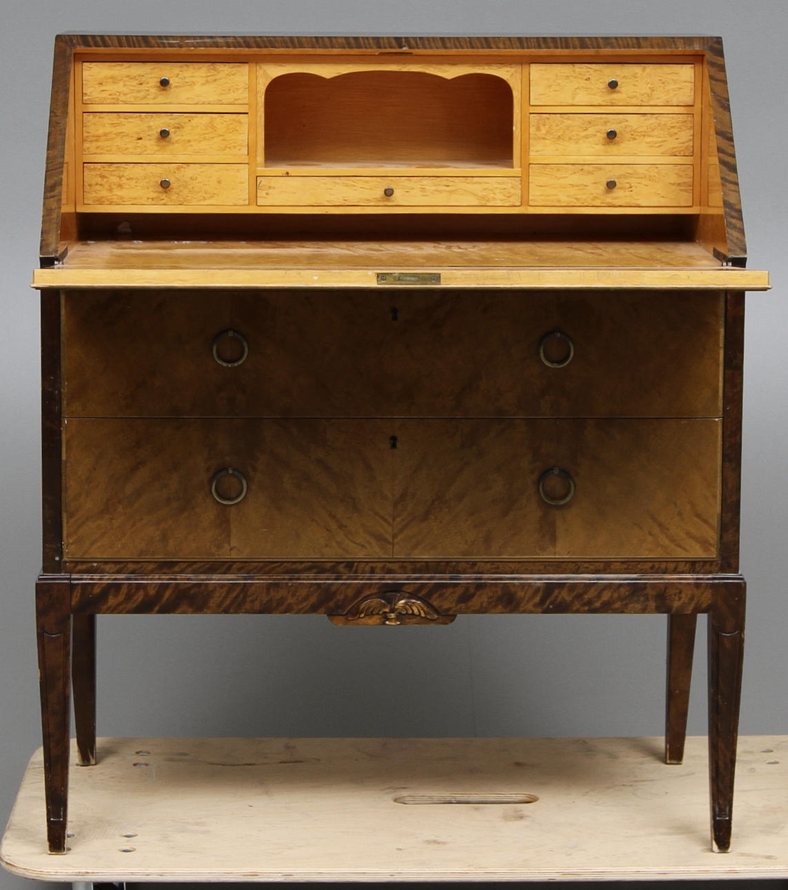 Fanerad i björk, klaffen med intarsia ornamentering, inredd med sju lådor och fack. Längd 86, bredd 43, höjd 102 cm.