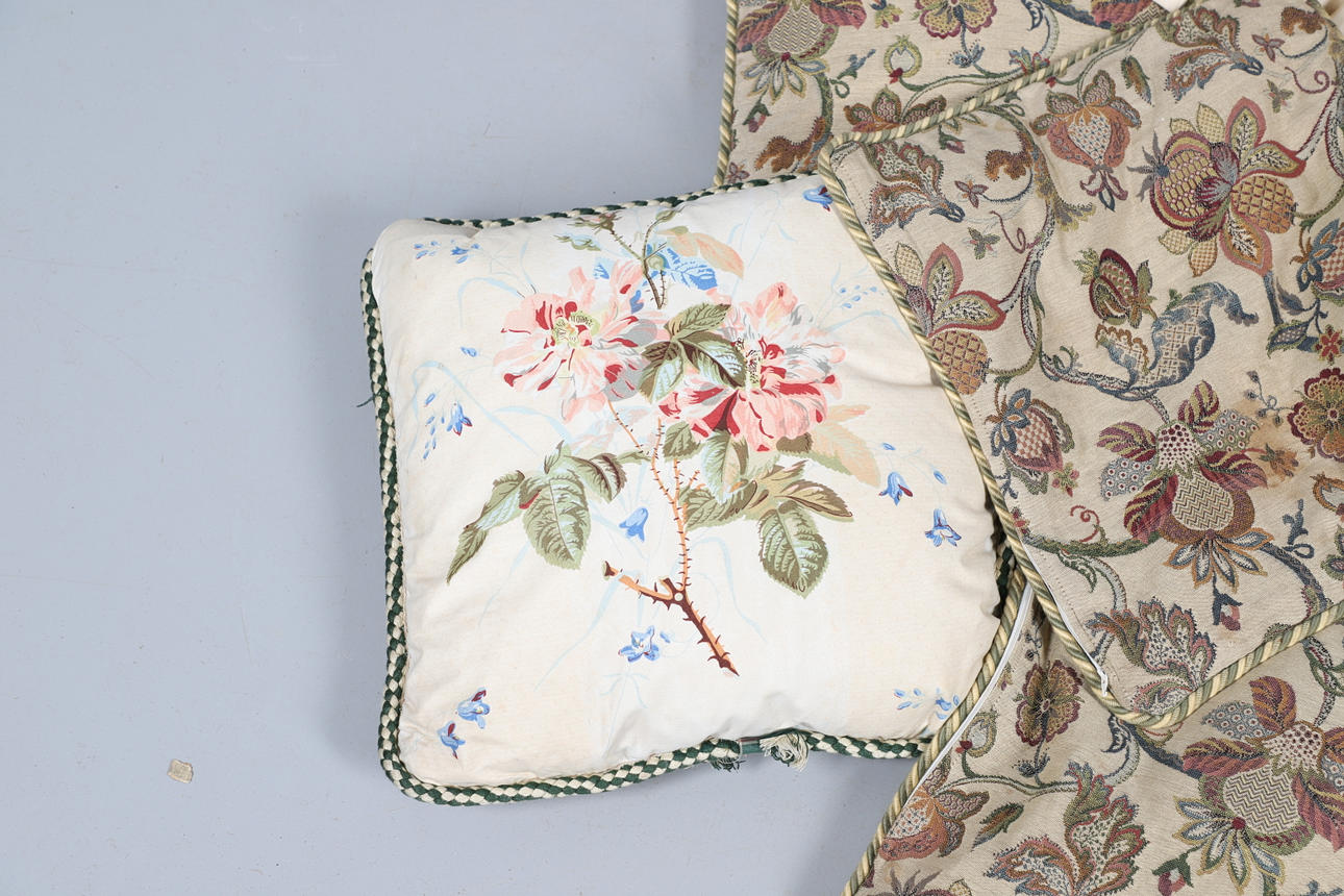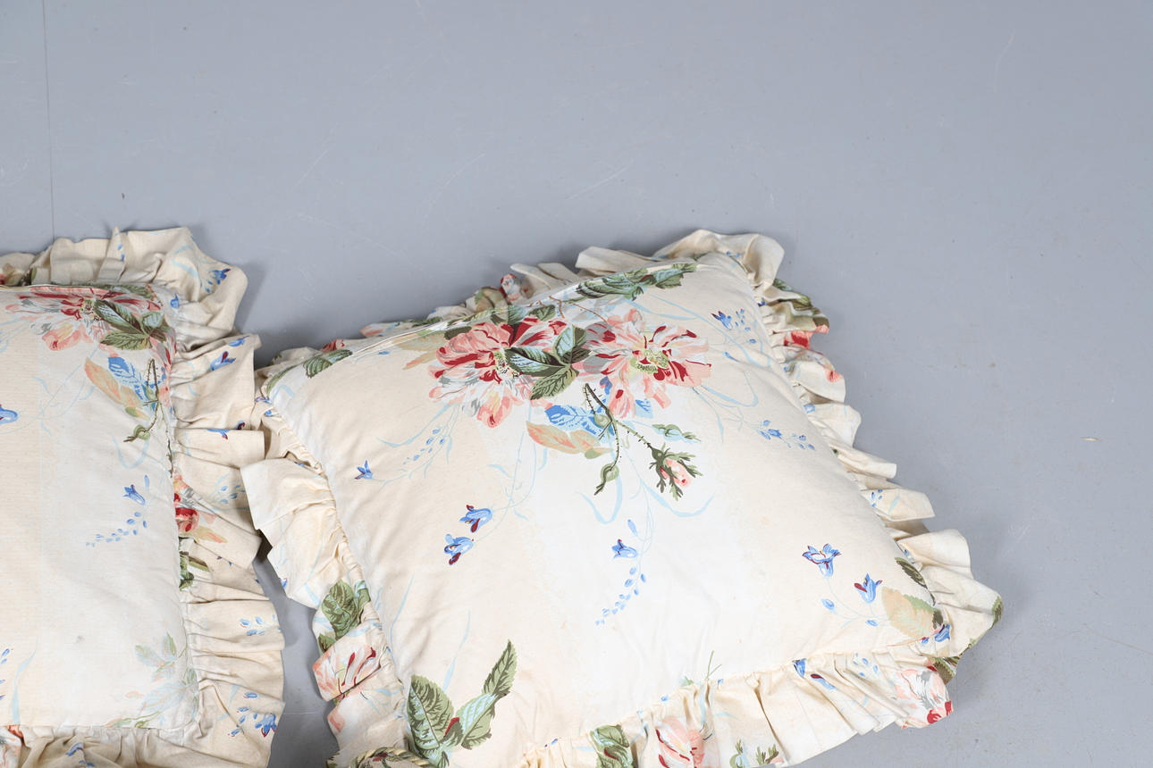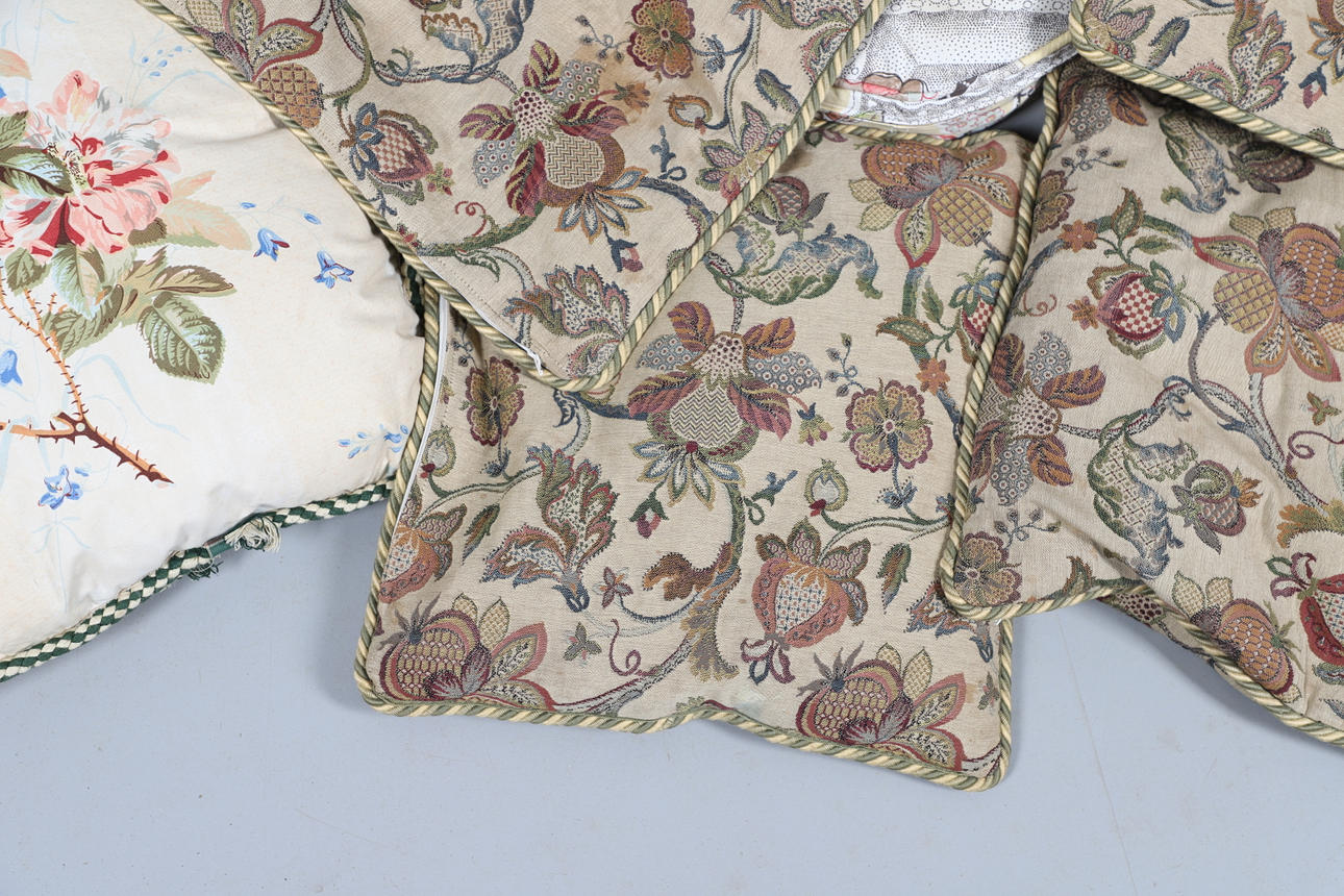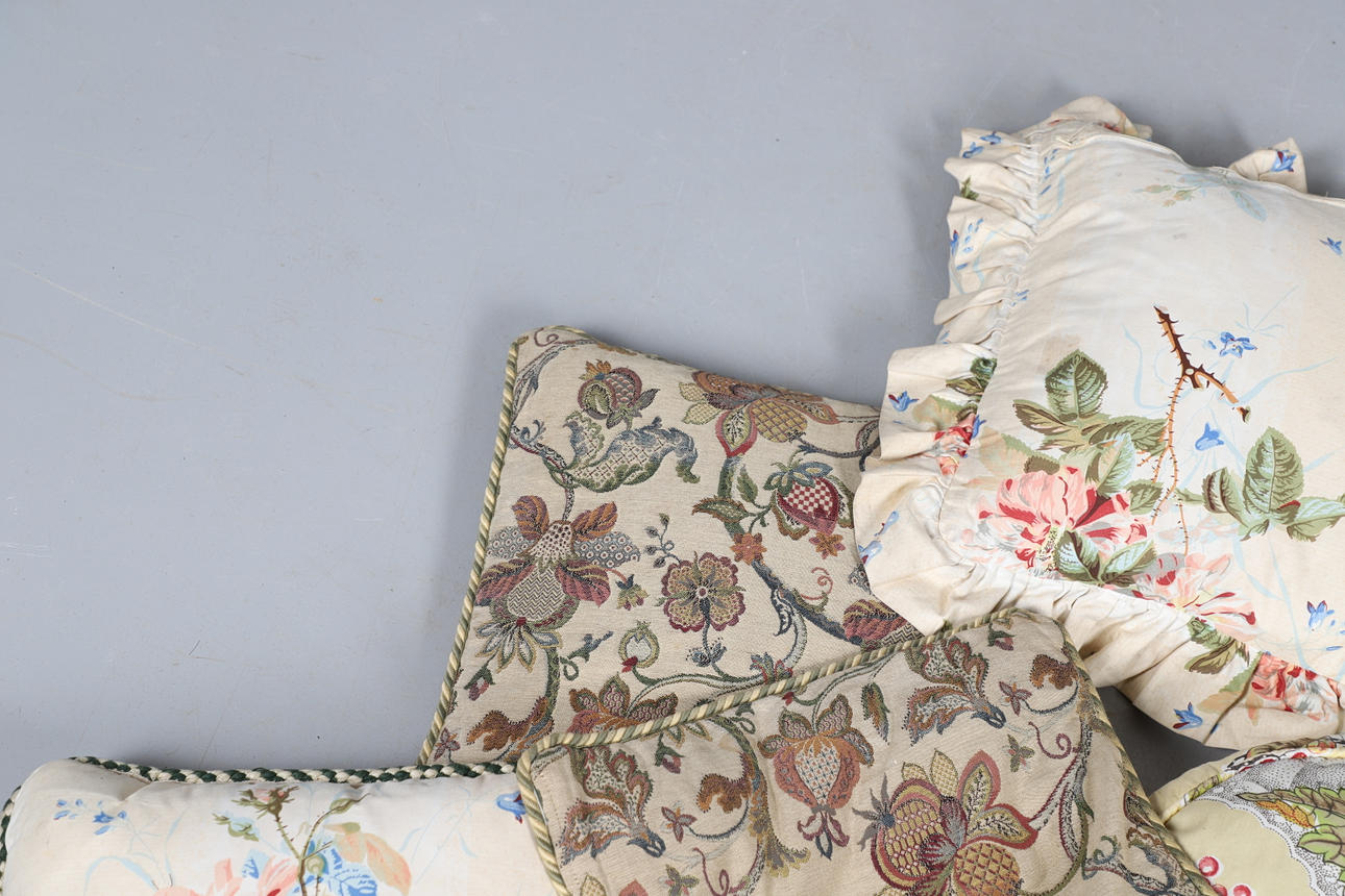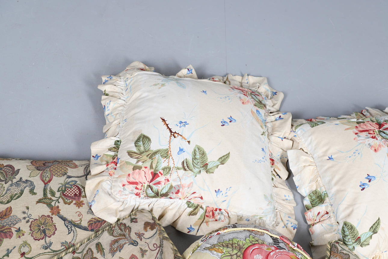 Består av en uppsättning av 6 blommiga handarbetskuddar, ytterligare ett par blommiga kuddar och andra diverse kuddar i blommig design. (Antal).