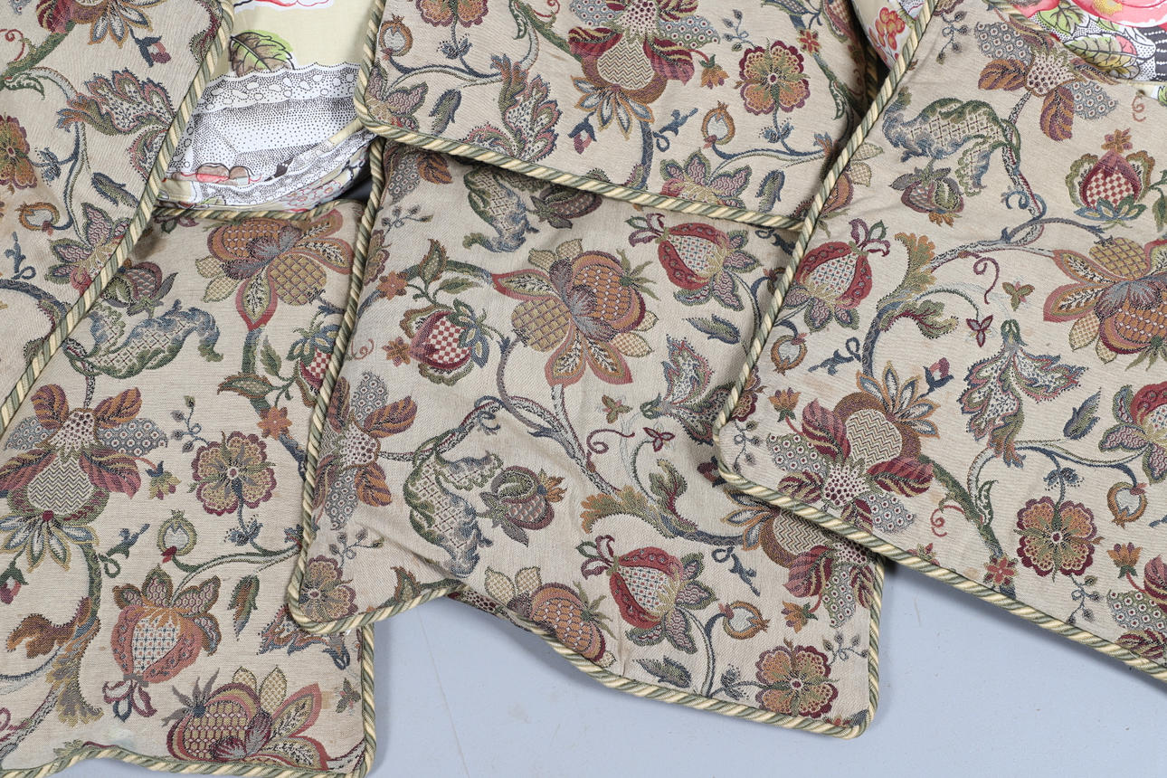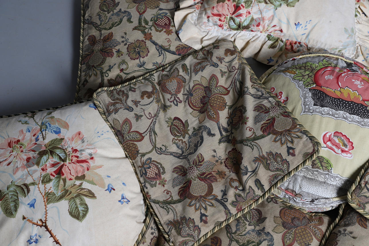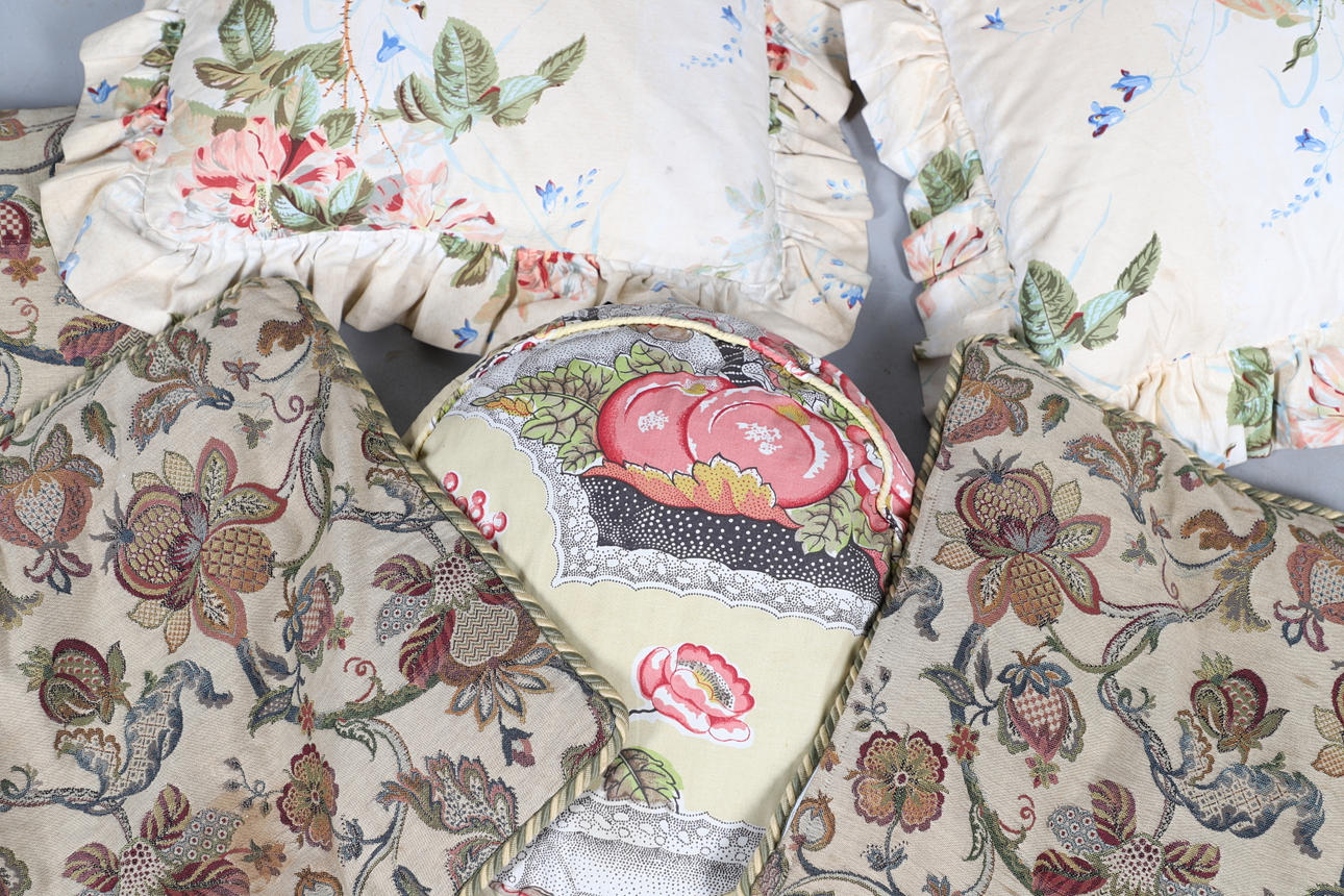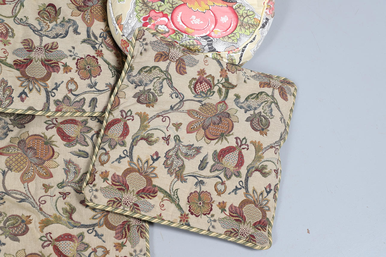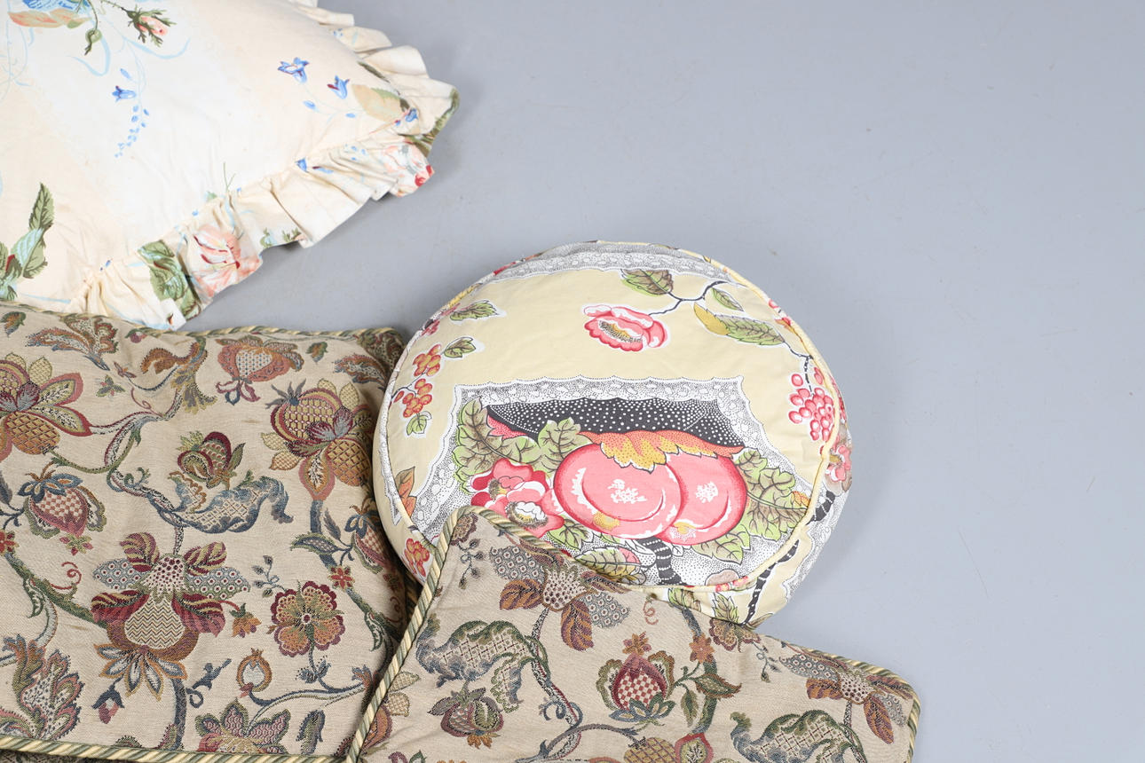 Består av en uppsättning av 6 blommiga handarbetskuddar, ytterligare ett par blommiga kuddar och andra diverse kuddar i blommig design. (Antal).