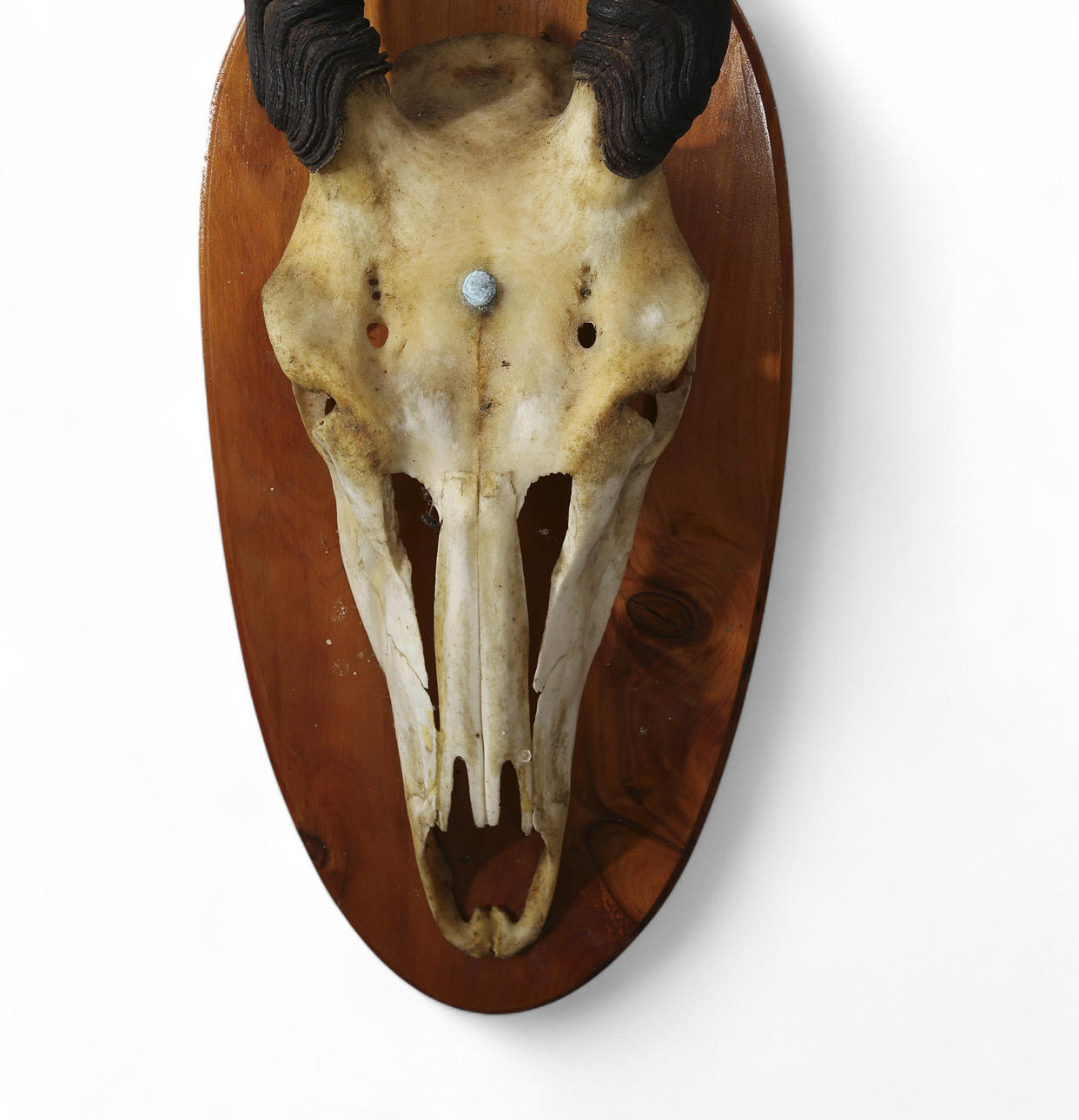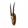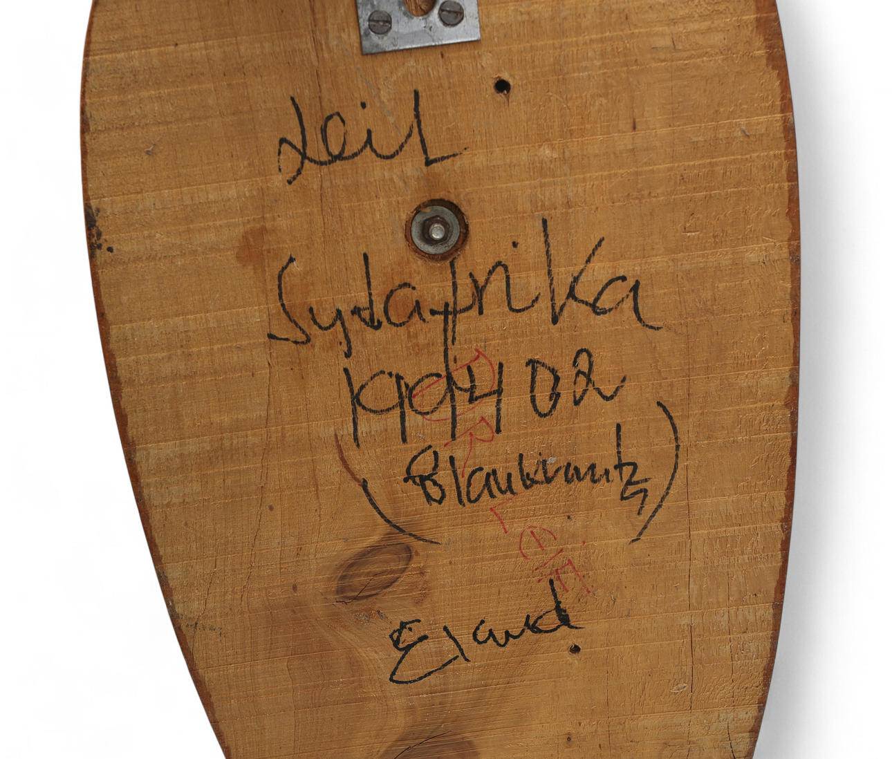 Fälld i Sydafrika i februari 1994. Monterad på oval platta av trä, med upphängningsanordning.