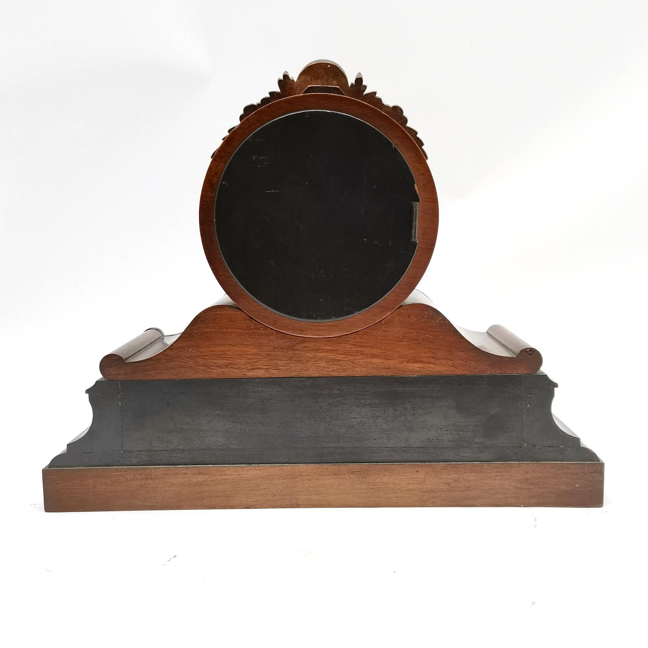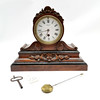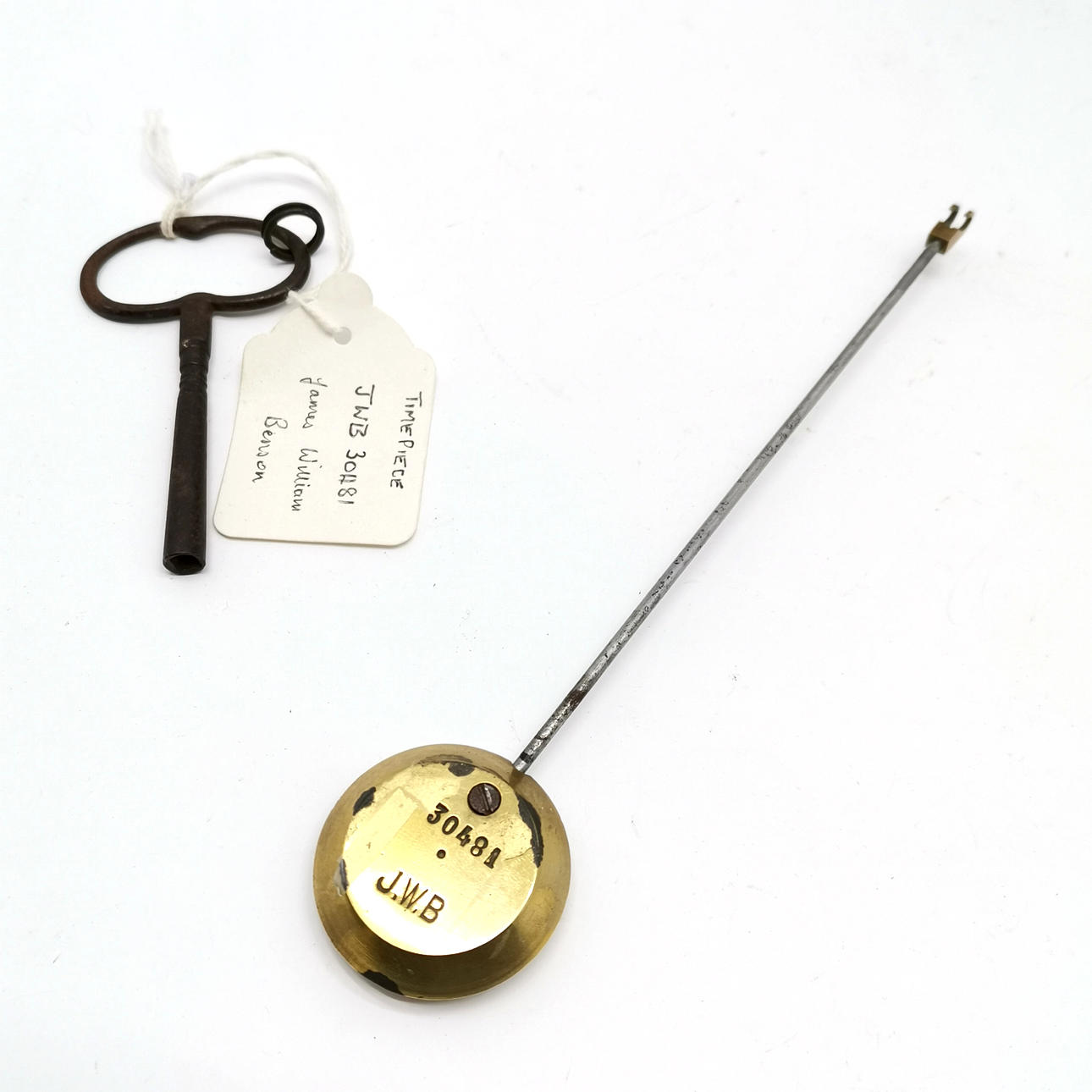 J W Benson antik mantelklocka i trä med original pendel+nyckel - 27cm hög x 32cm x 13cm djup.