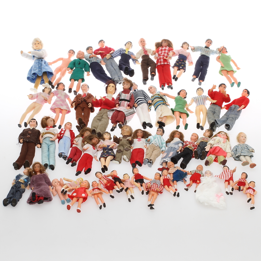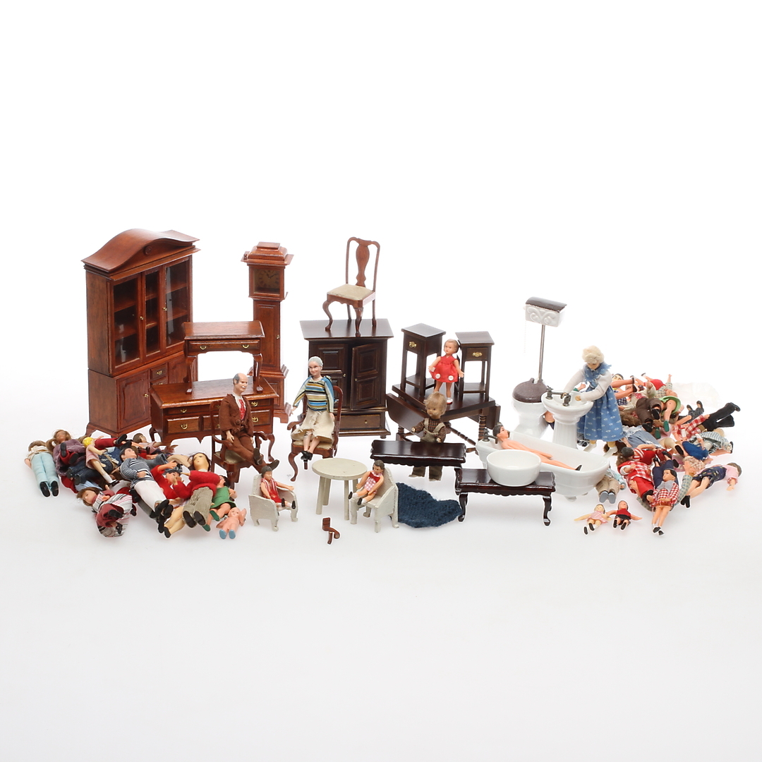 399731. DOCKSKÅPSMÖBLER samt DOCKSKÅPSDOCKOR, 1900/2000-tal. (V).