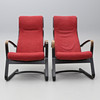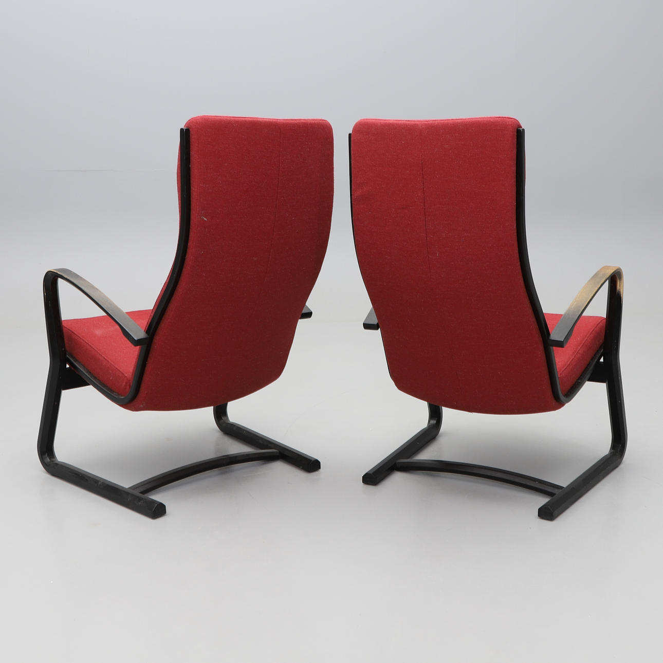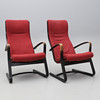 Svartlackerat skiktlimmad trä. Stoppad och textilklädd sits och rygg. Märkt. Bredd 66, rygghöjd ca 103, djup ca 80, sitthöjd 45 cm.