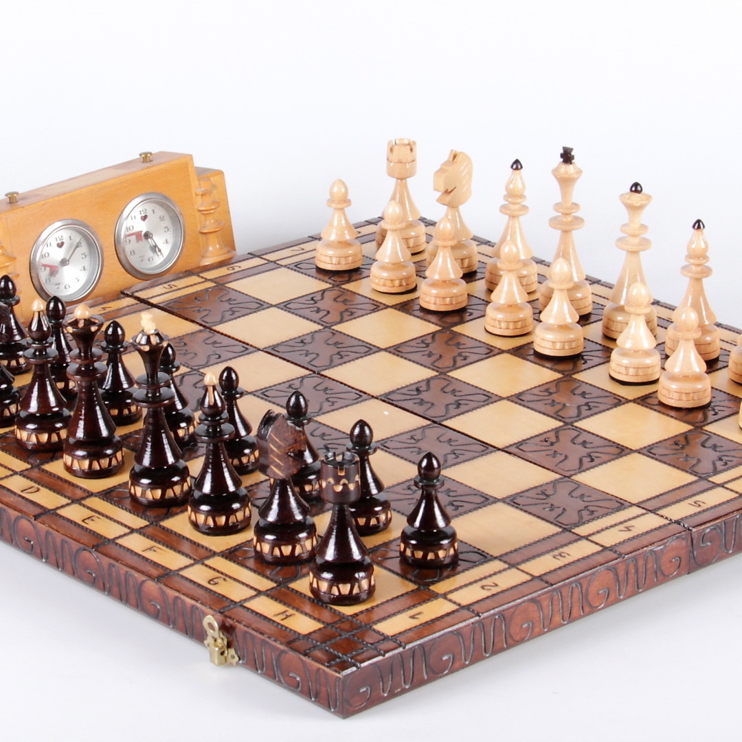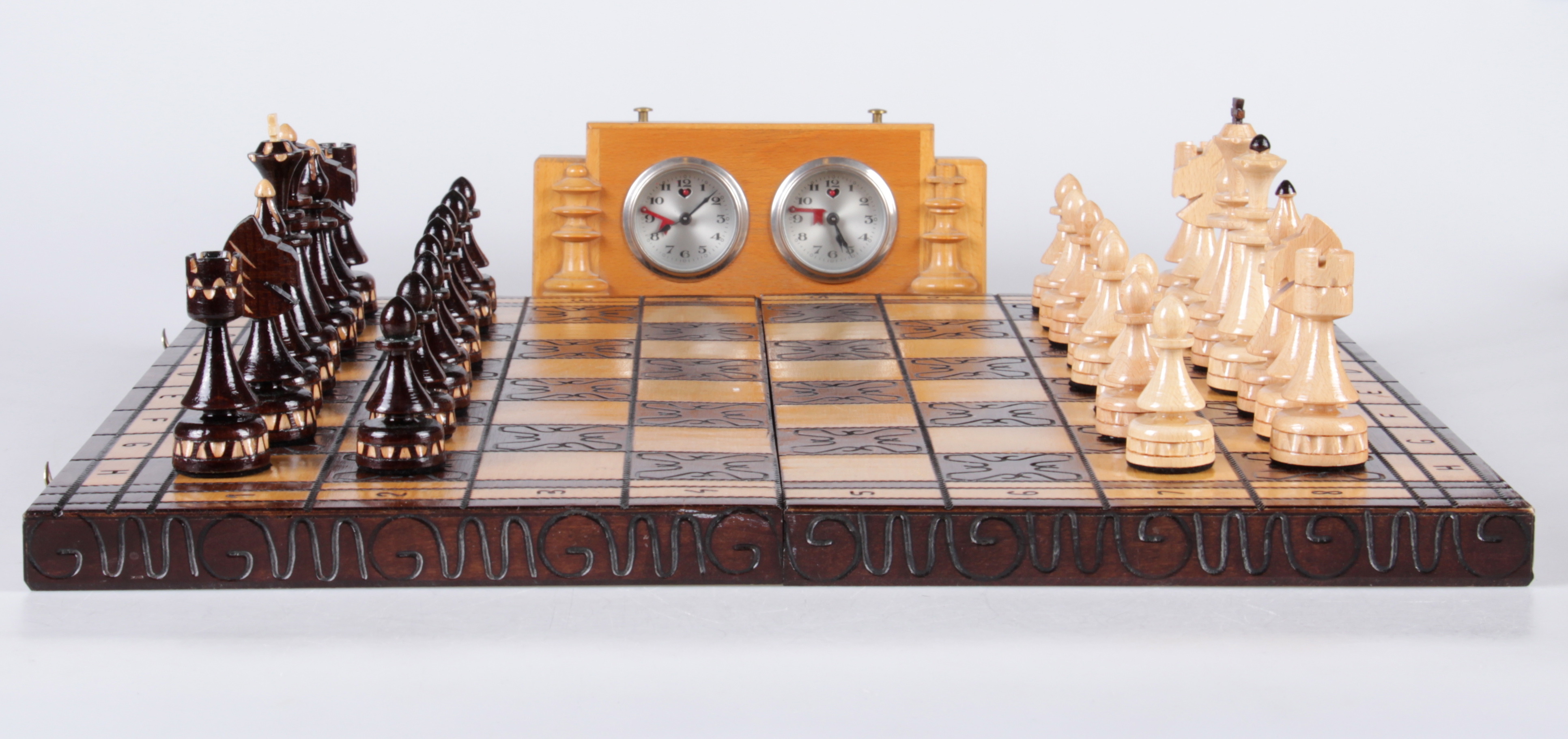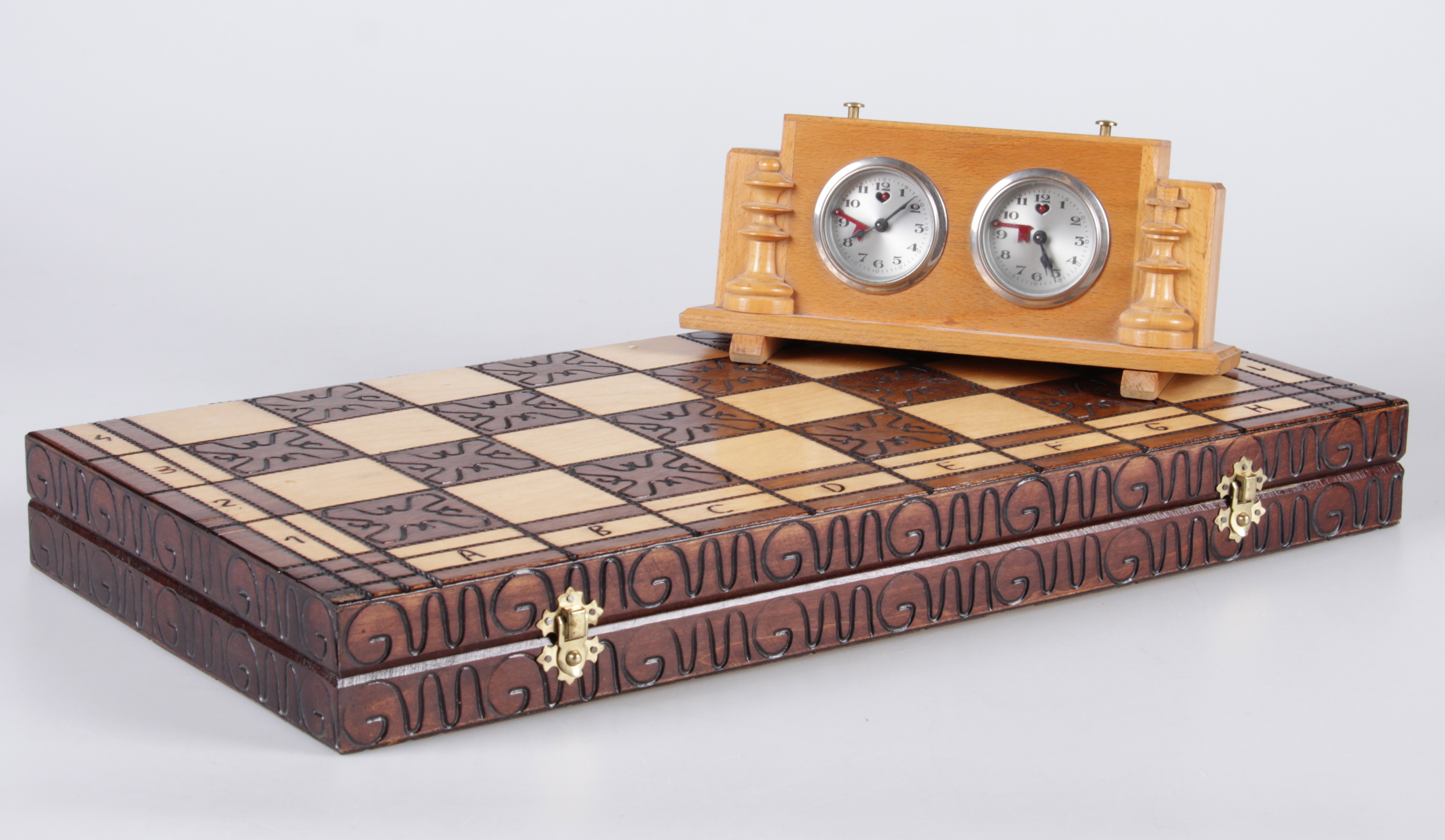 400950. SCHACK, samt schackklocka, trä, 1900-tal.