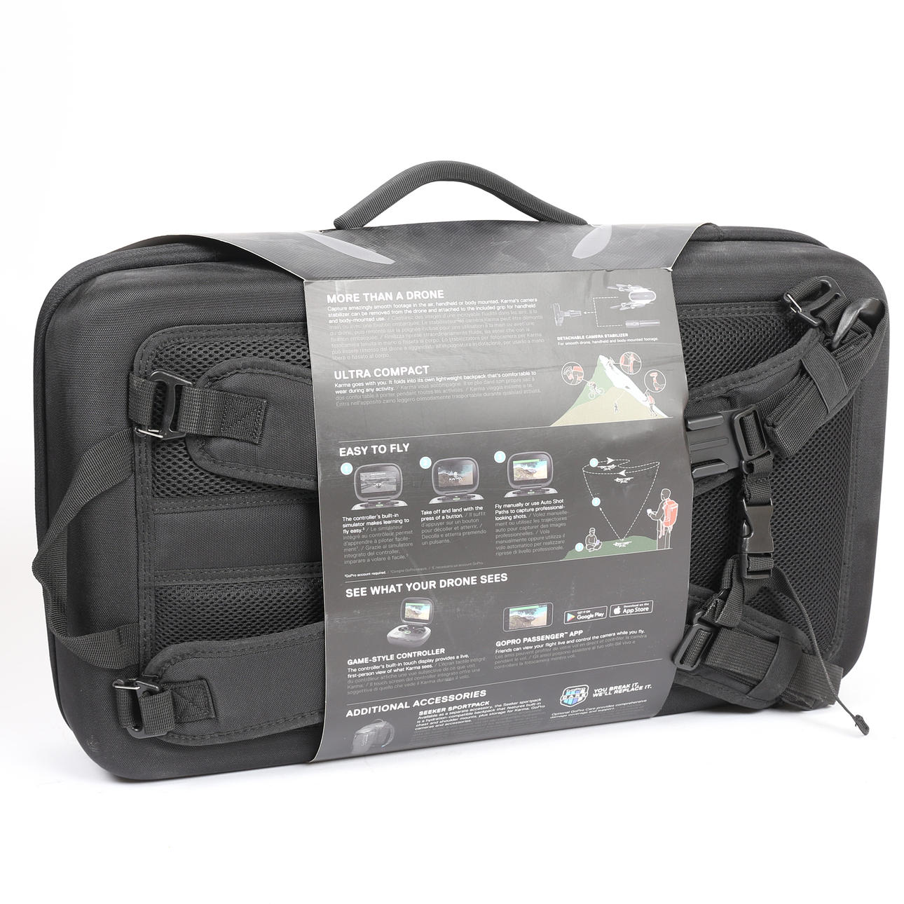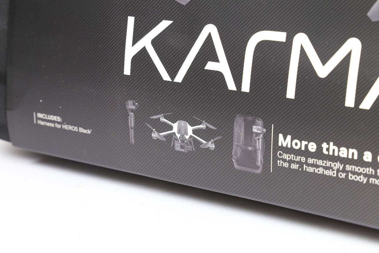 Inklusive Karma drone, styrenhet, stabilisator, hero5 svart sele, sex propellrar, batteri, laddare och fodral, serienummer E5112324584001.