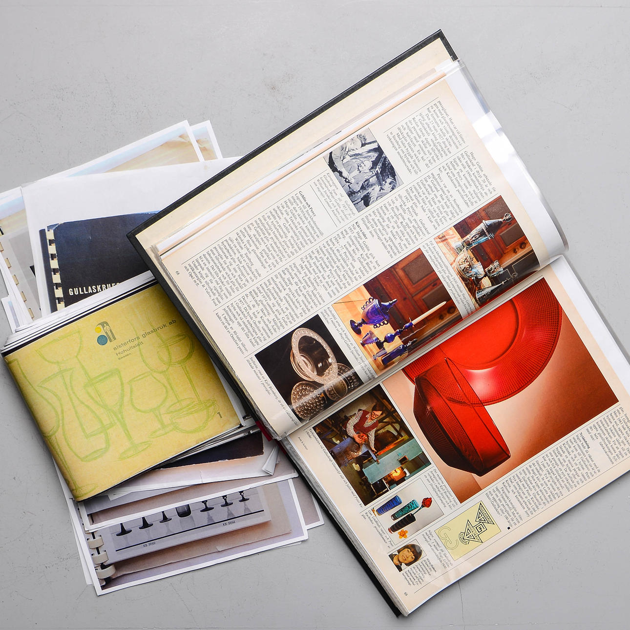 Klippsamling med artiklar om följande glasbruk: Boda, Eda, Gullaskruf, Holmegaard, Hovmantorp, Iittala, Kosta, Limmared, Nöstetangen, Orrefors, Pukeberg, Reijmyre, Venini och Åfors.