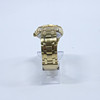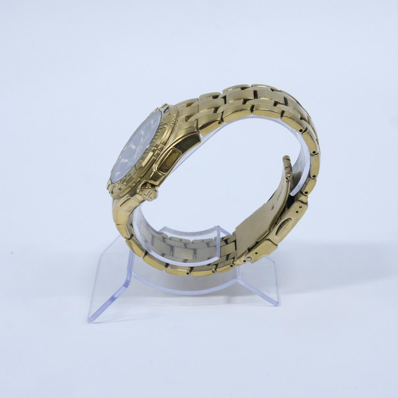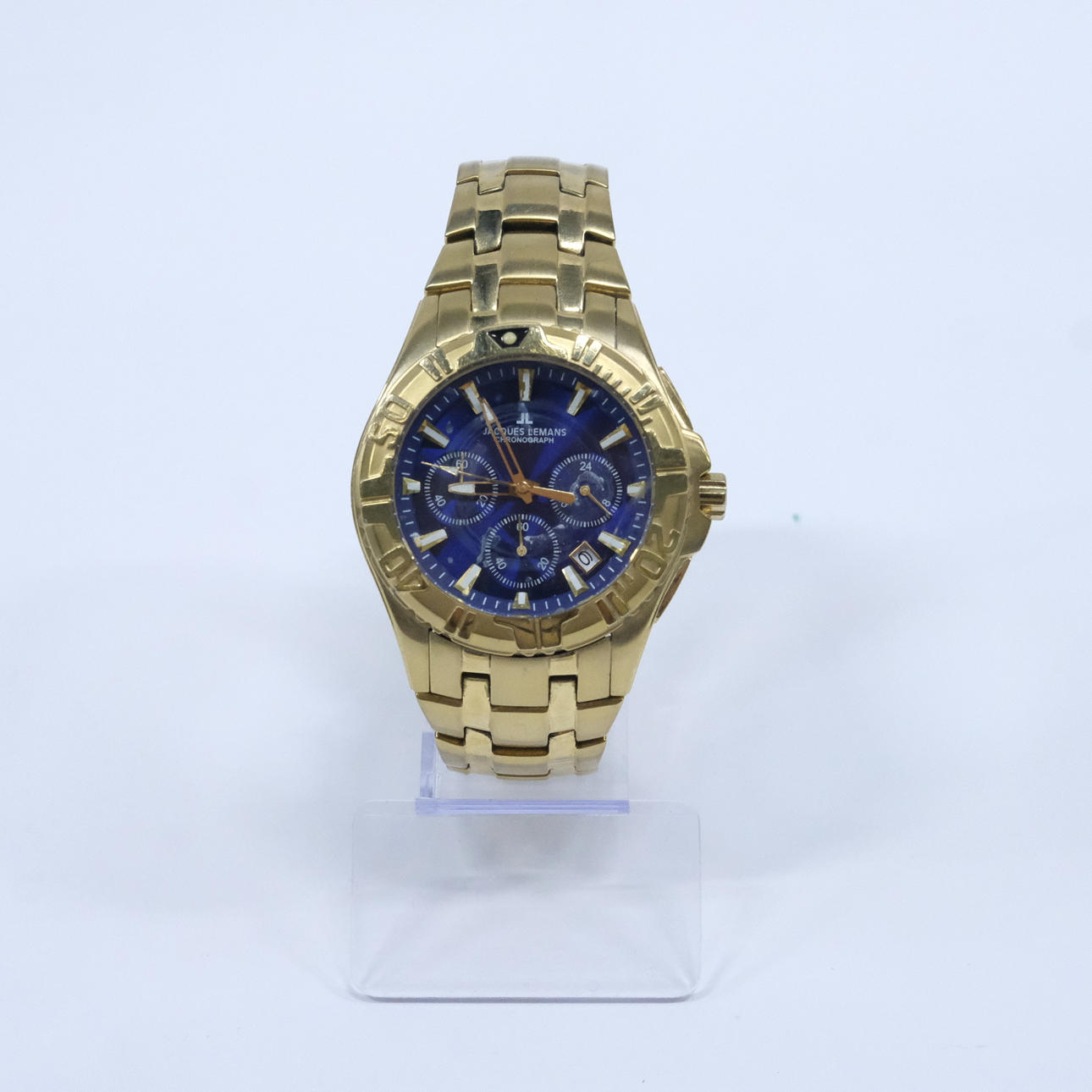 Gulmetall med blå urtavla. Kvartsur, datumvisning, viklås. Diameter 4,2cm.
