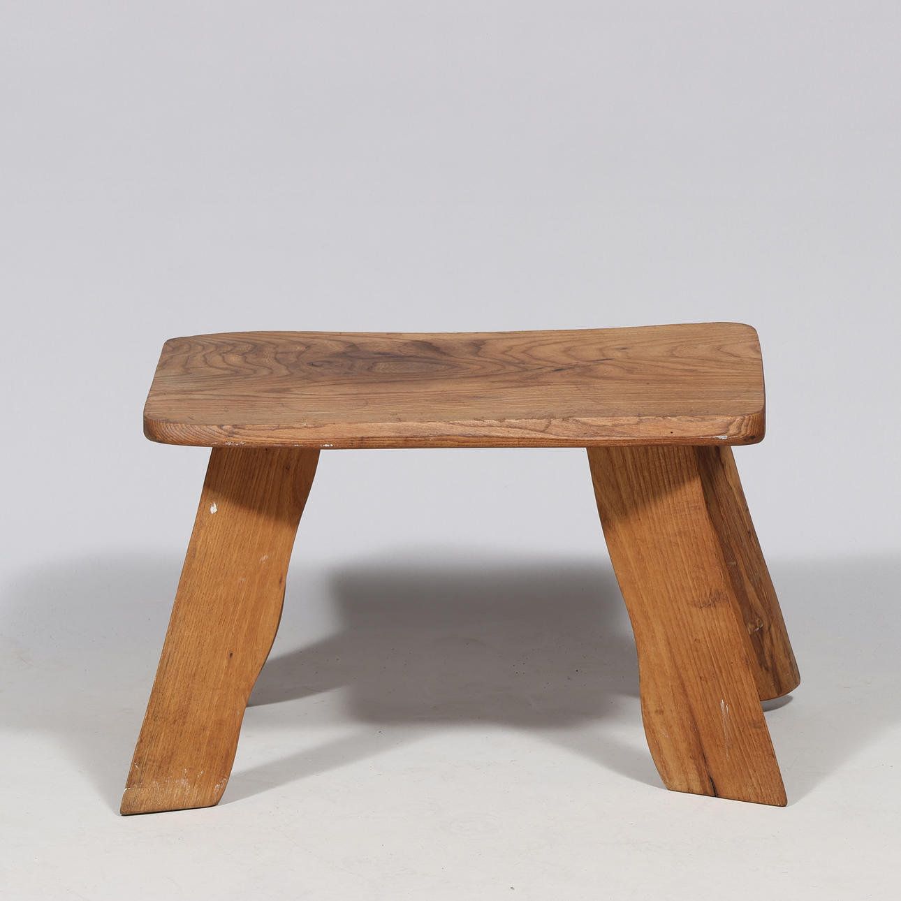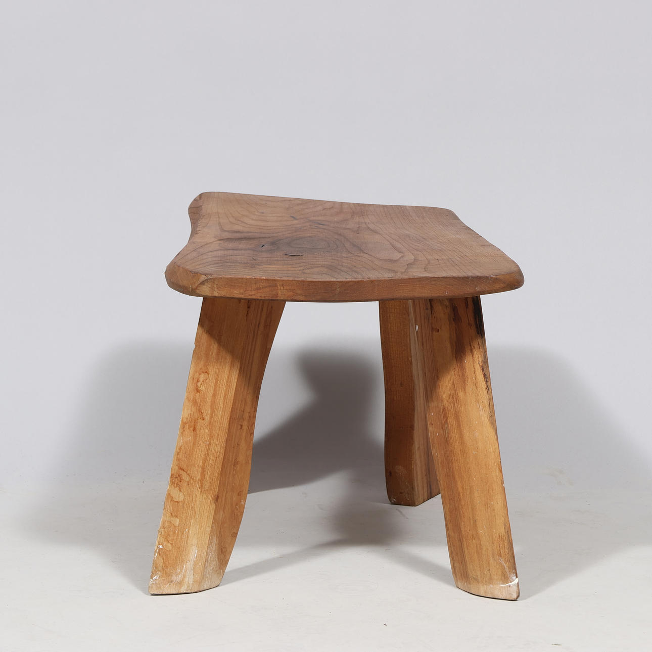 Soffbord/sidobord/pall av massivt trä i brutalistisk stil. Höjd: 38 cm. Längd: 58,5 cm. Bredd: 42 cm.