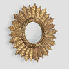 Solformad väggspegel av trä målad med guldfärgad färg.