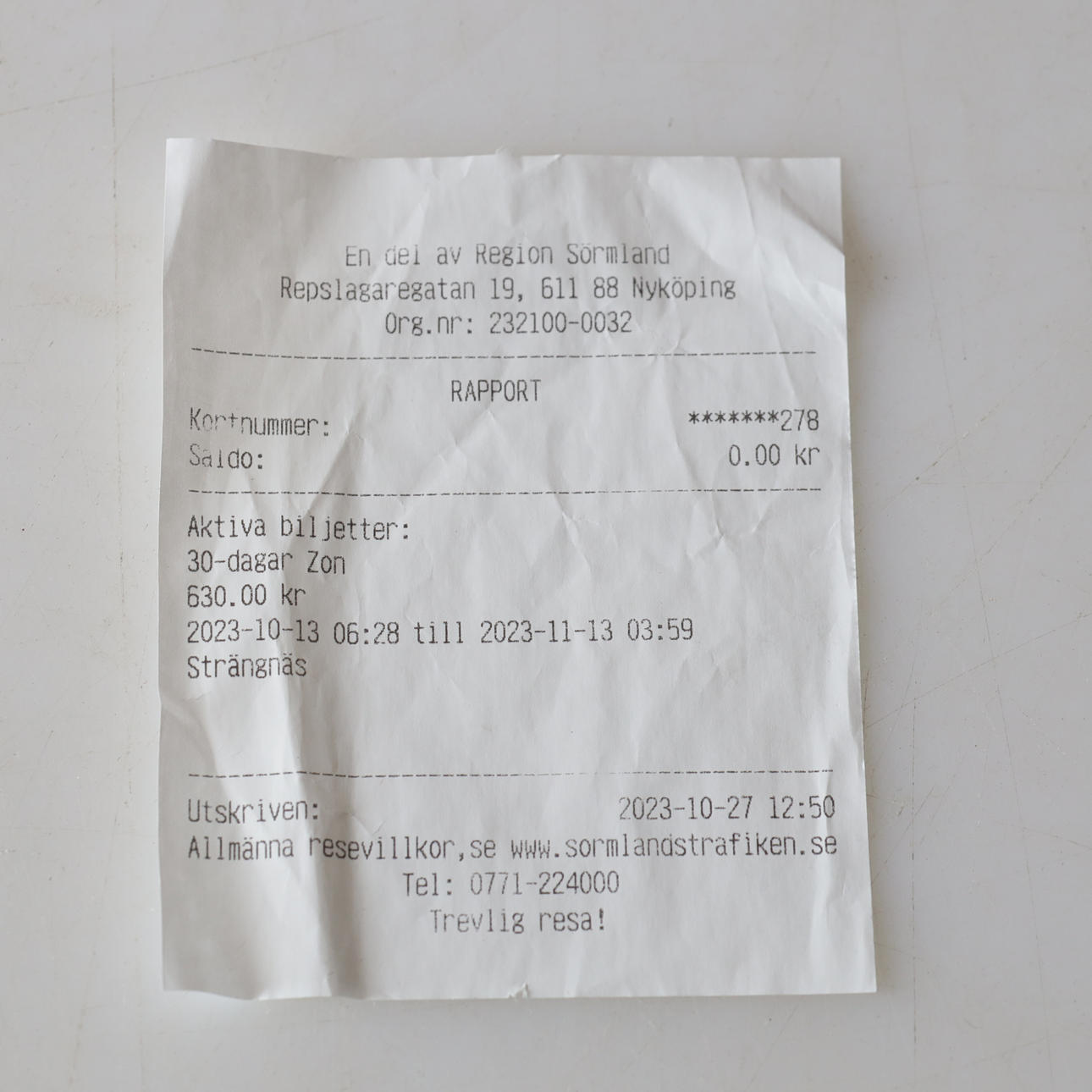 Tillhörande kvitto med nyligen tankat belopp för 30 dagars biljett.