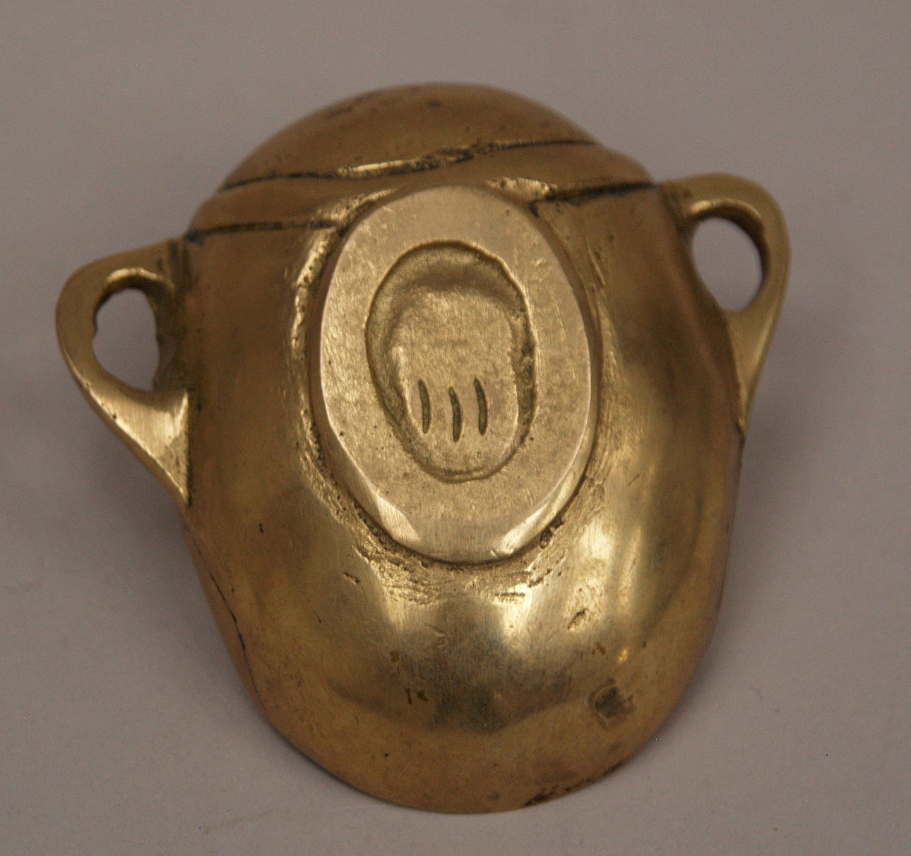 askkopp - förmodligen Japan, gjutgult, i form av en oni-mask, l.ca. 8,5 cm.