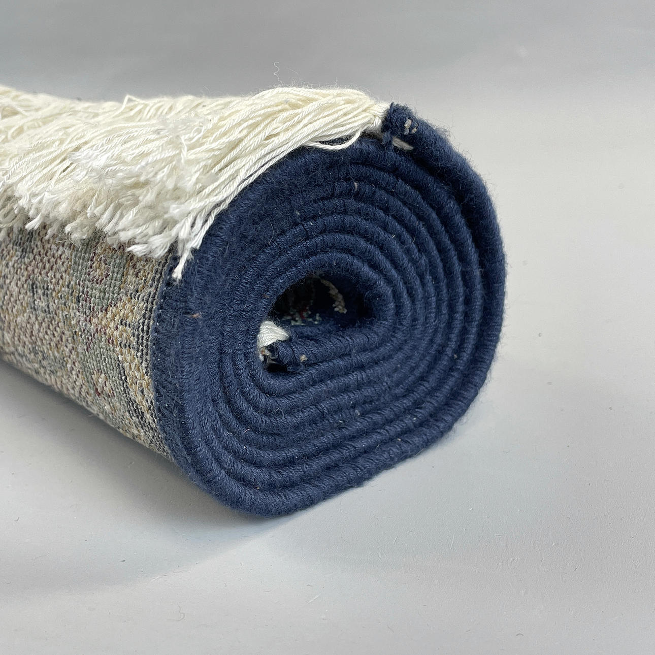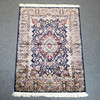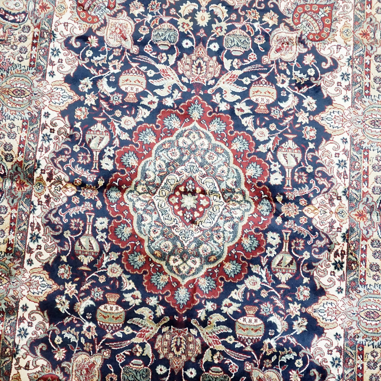 Maskinvävd matta med polykromt, figuralt och floralt mönster med centrerad medaljong mot mörkt blå fond.
