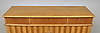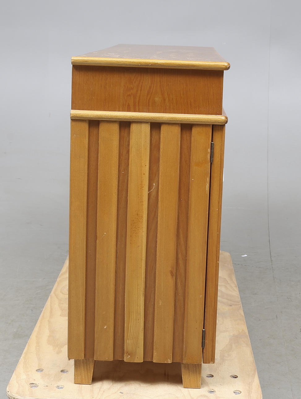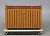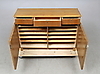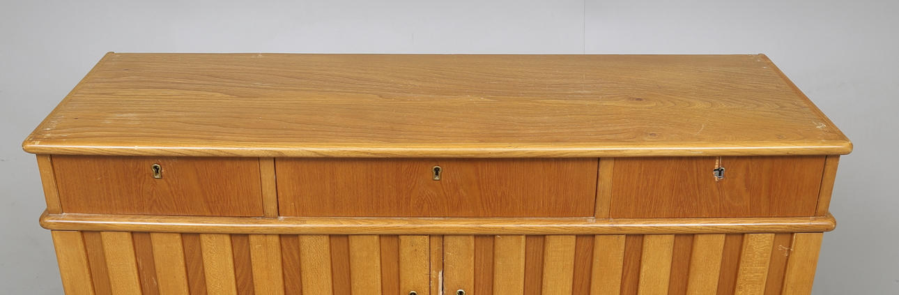 Hyllplan och fack bakom dörrpar. Tre lådor. Längd 112 cm, bredd 35 cm, höjd 78 cm.