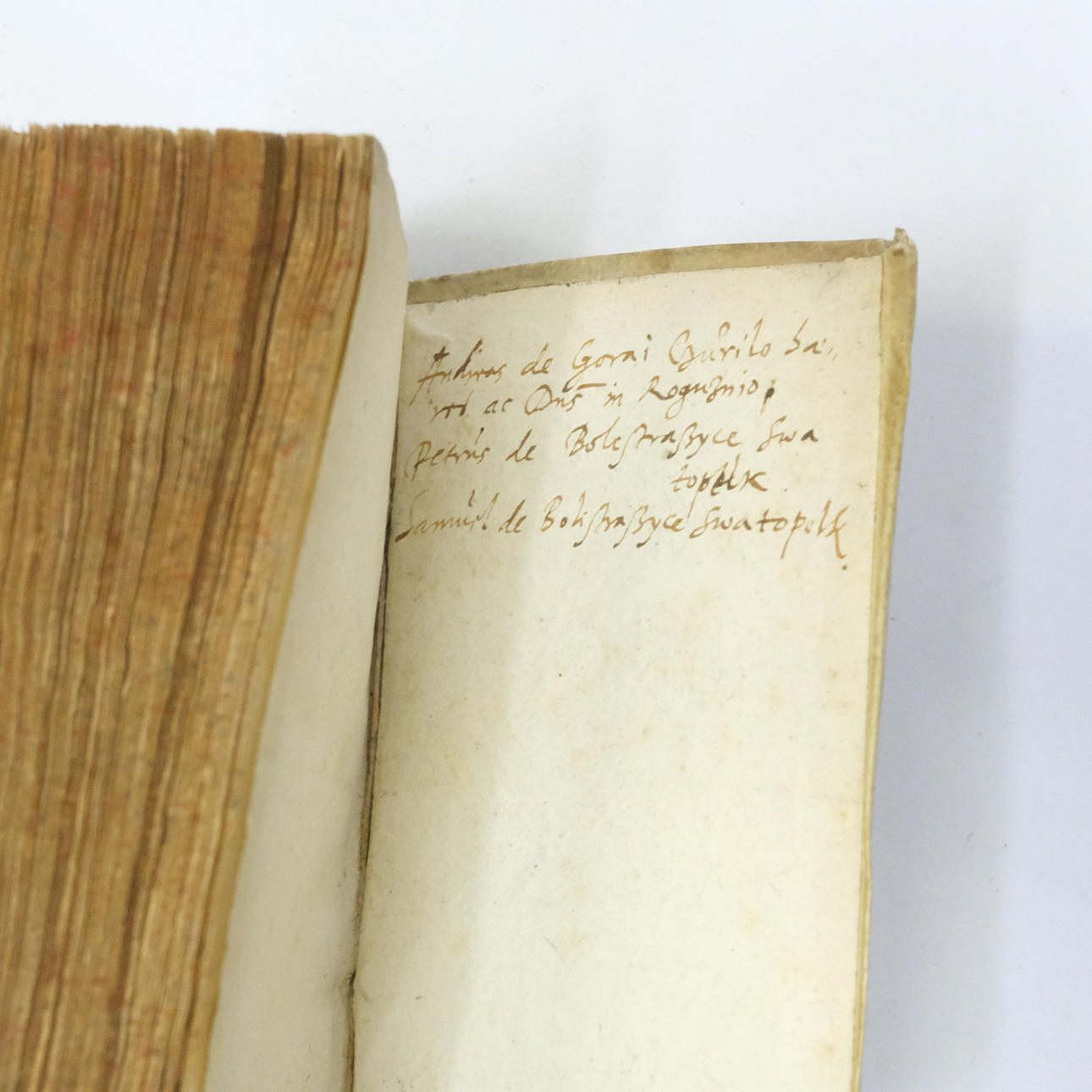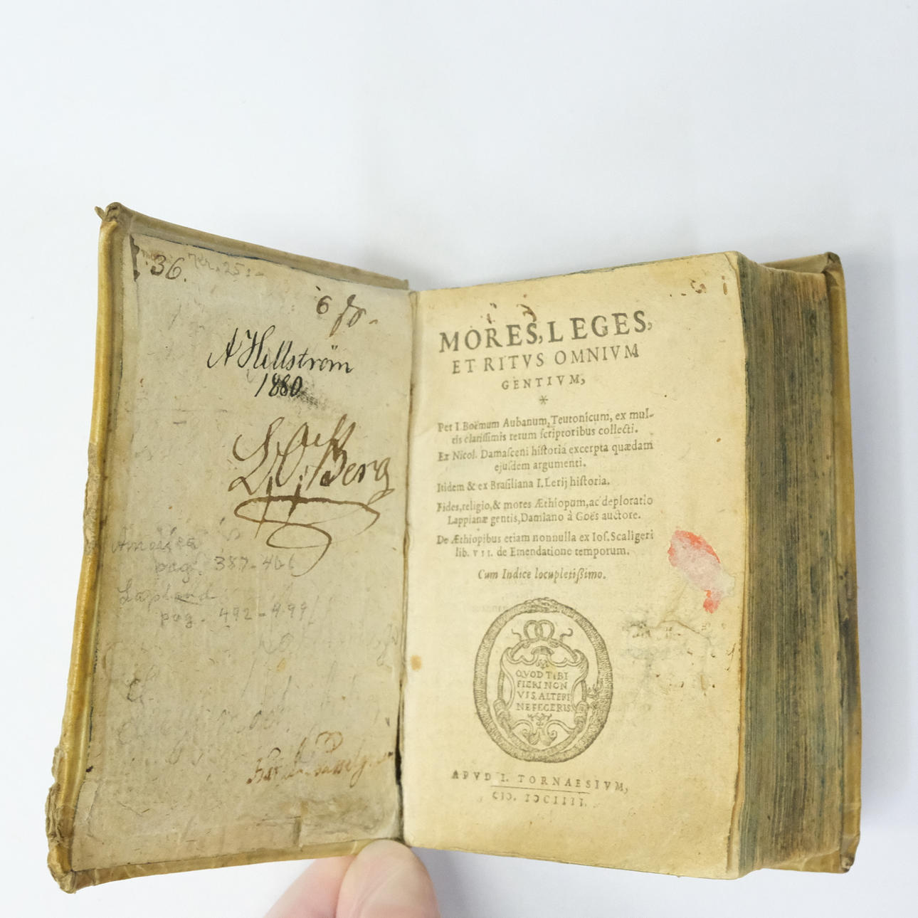 Det ena Johann Boehme. "Mores, leges, et ritus omnium gentium", Jean de Tournes 1604, pergamentband med stämplad dekor.
