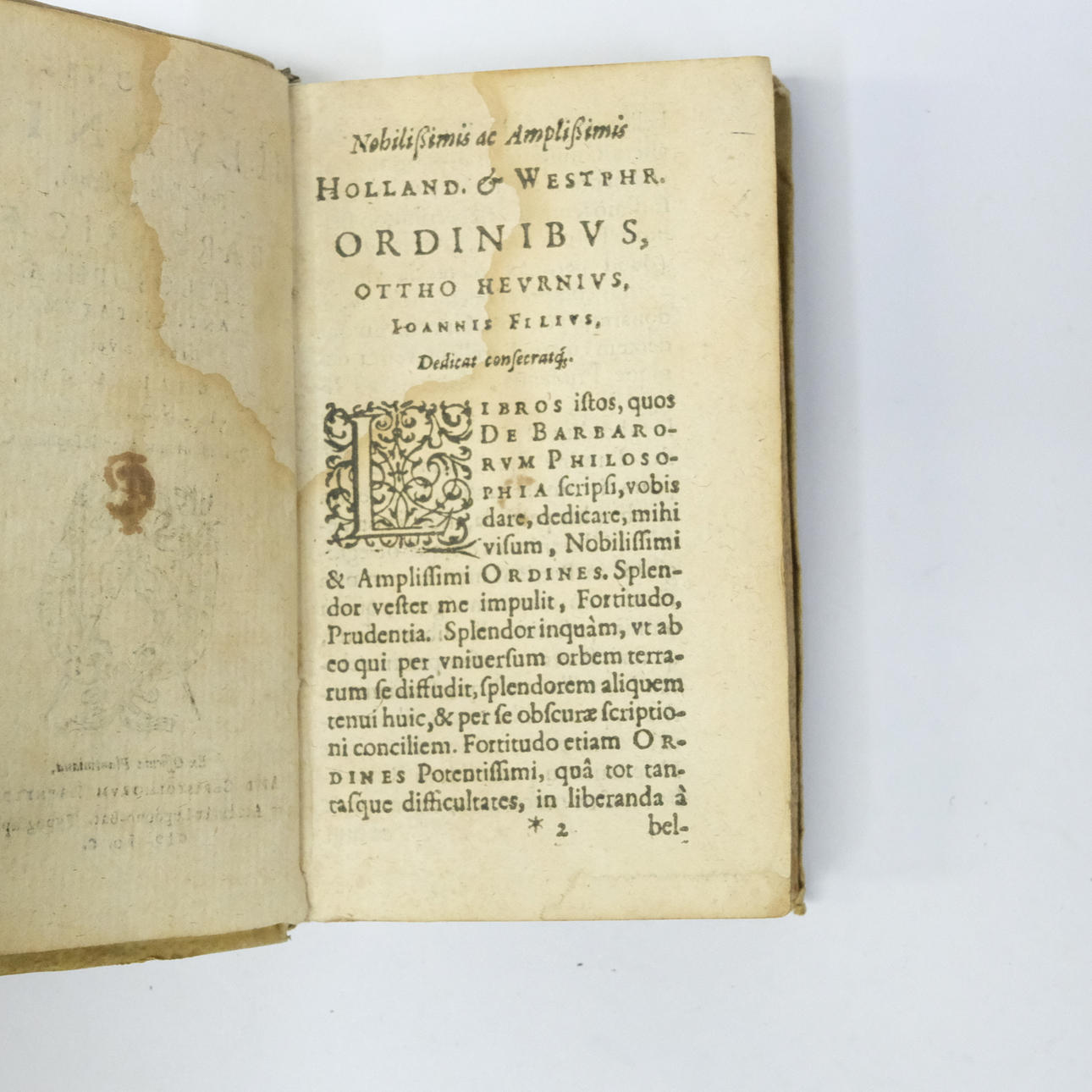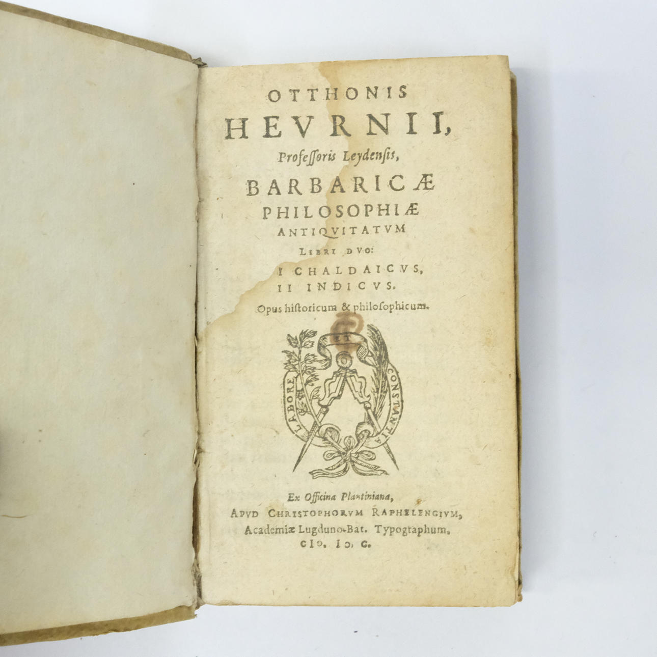 Det andra Otto Heurne, "Barbaricae philosophiae antiquitatum", libri duo, helt pergamentband, 1600/ 1608.