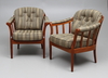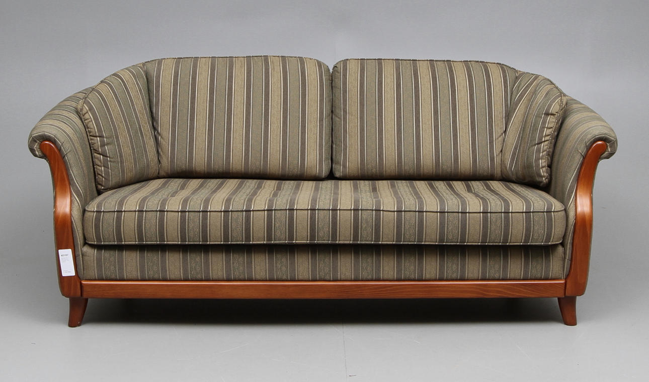 Soffa och två fåtöljer med stomme i betsat trä. Klädsel i grön randigt tyg. Soffans längd ca 190 cm.