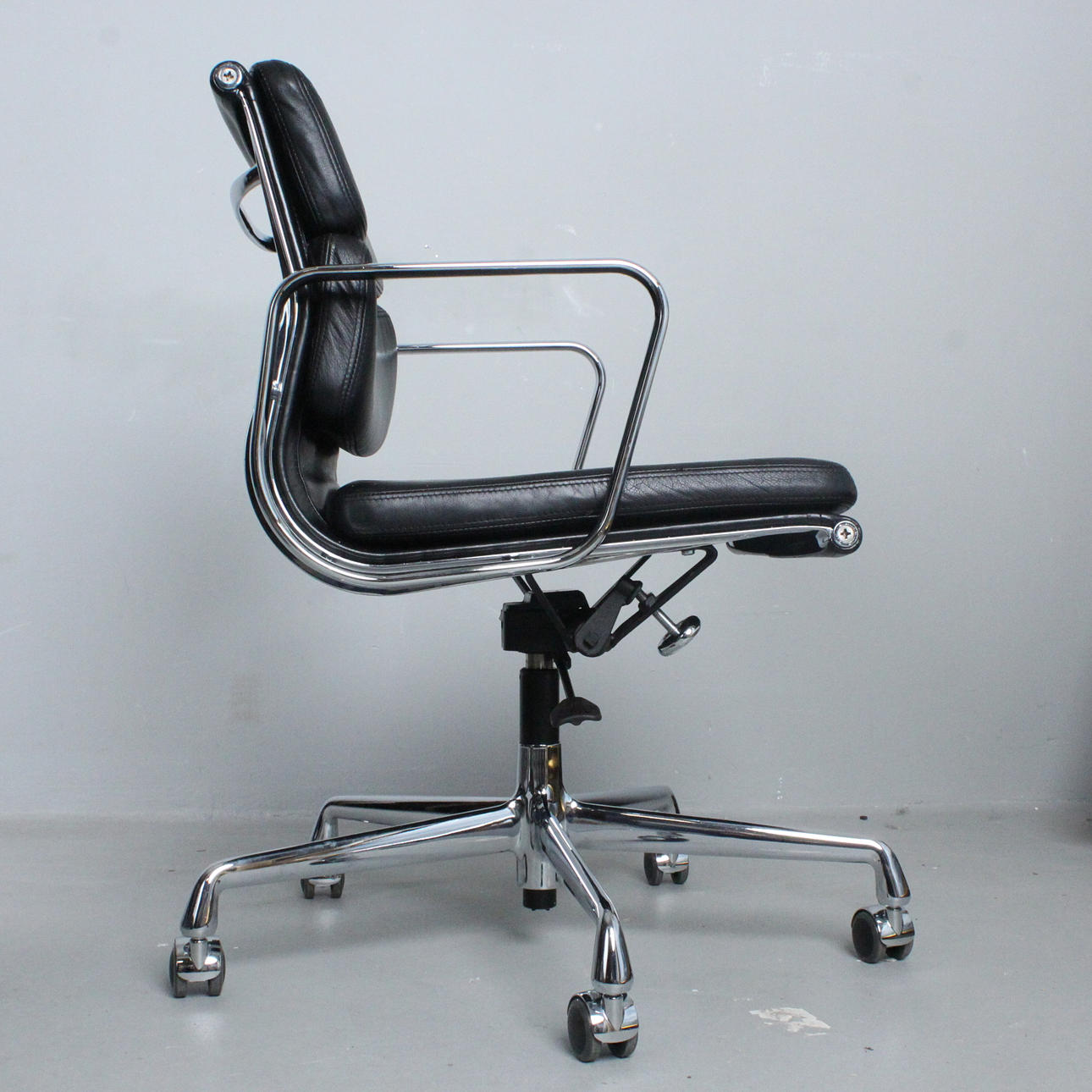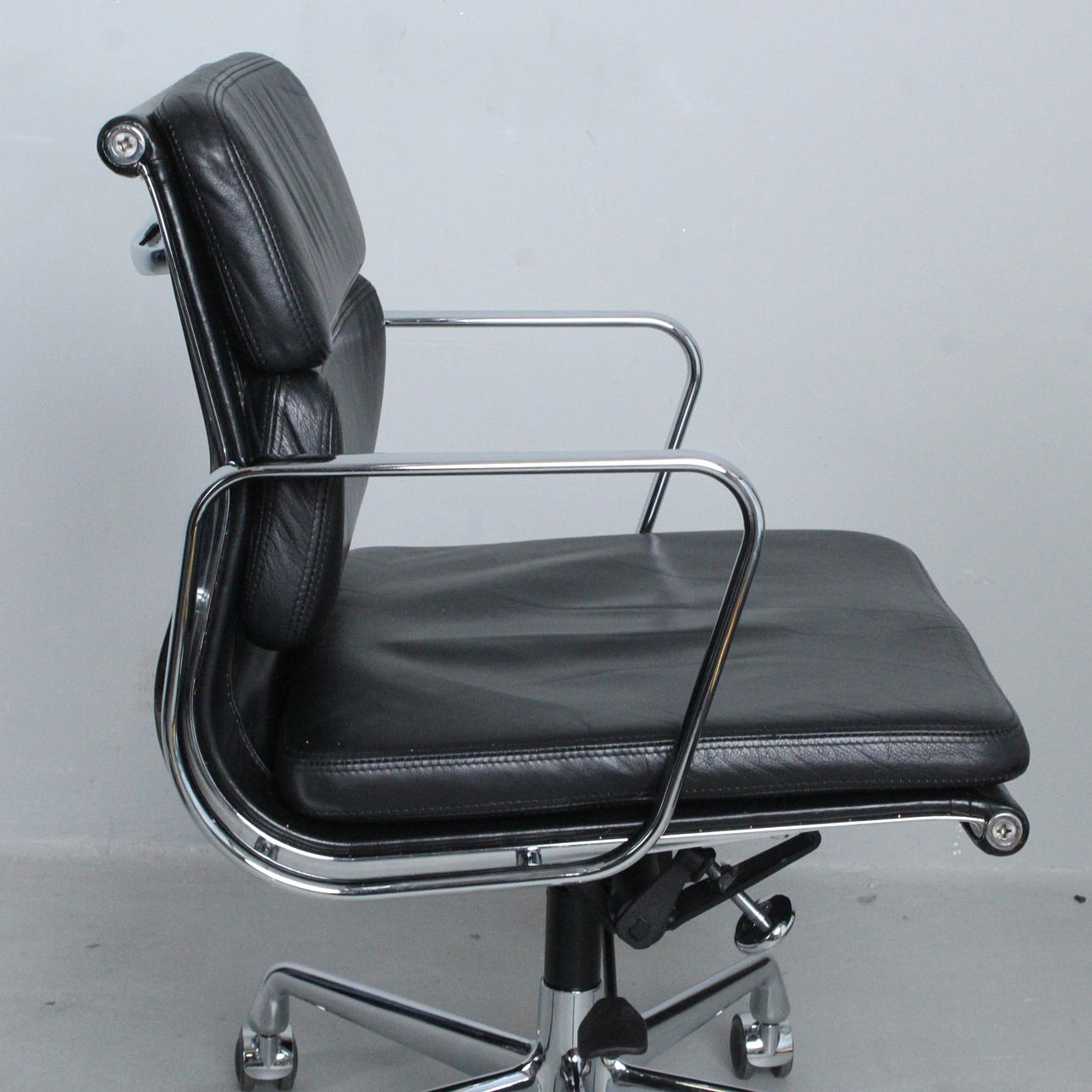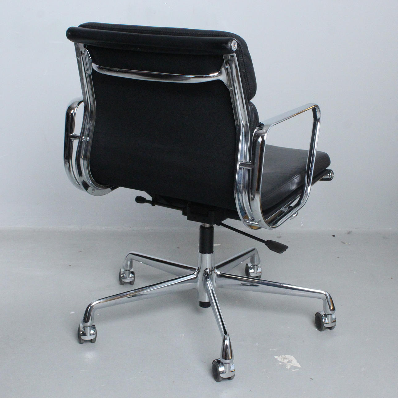 Charles & Ray Eames för Vitra, kontorsstol/kontorsstol, softpad, modell 'EA 217', design: 1969, läder; förkromad pressgjuten aluminiumram, stoppad och täckt med svart läder, höjdjusterbar, roterbar och med inbyggd ryggstödsmekanism,