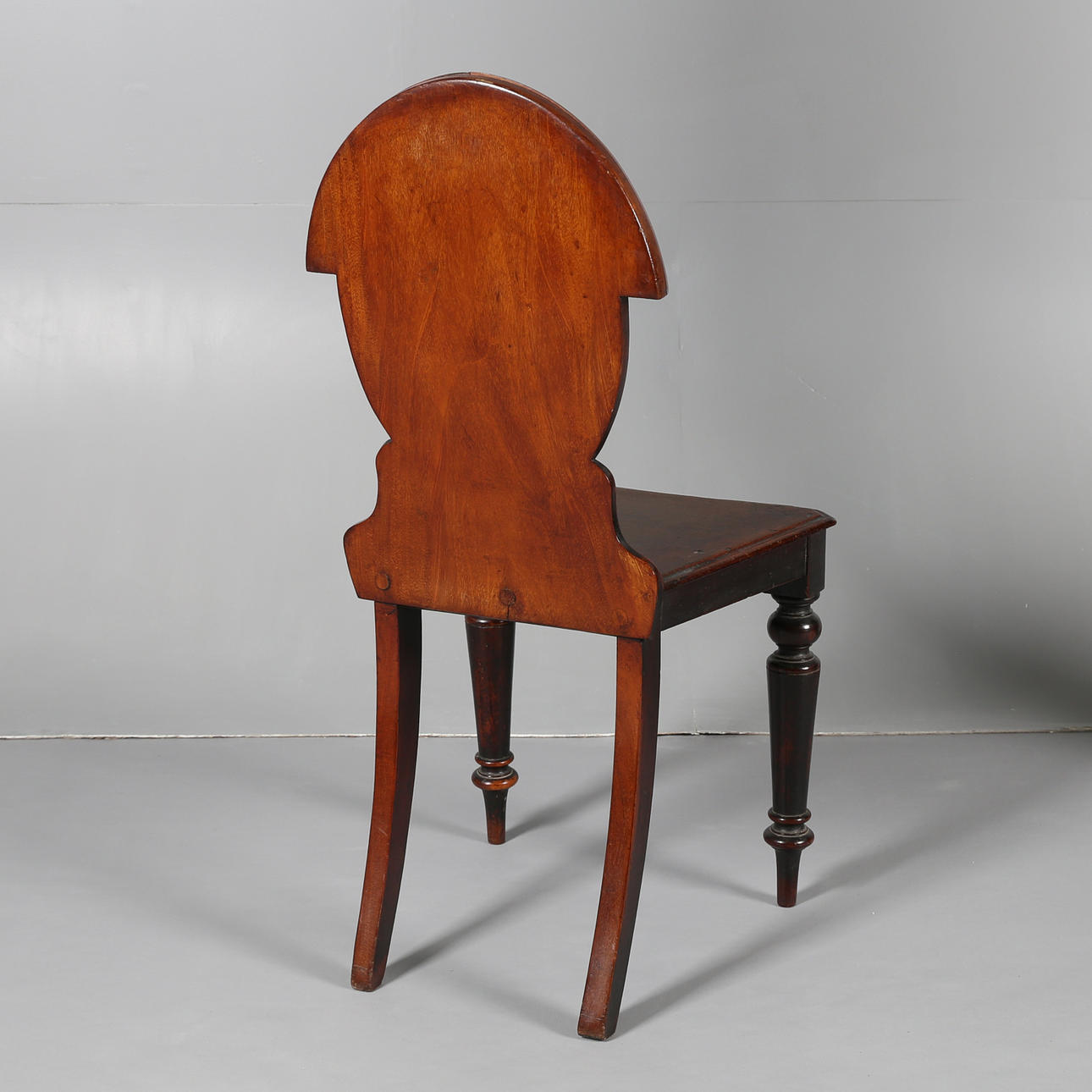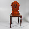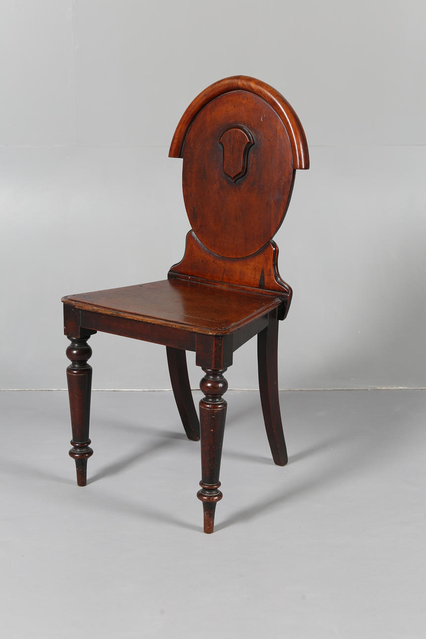 Har en oval rygg med en sköld i mitten, upphöjd på kulknoppade avsmalnande ben, 88 cm hög 44 cm bred.