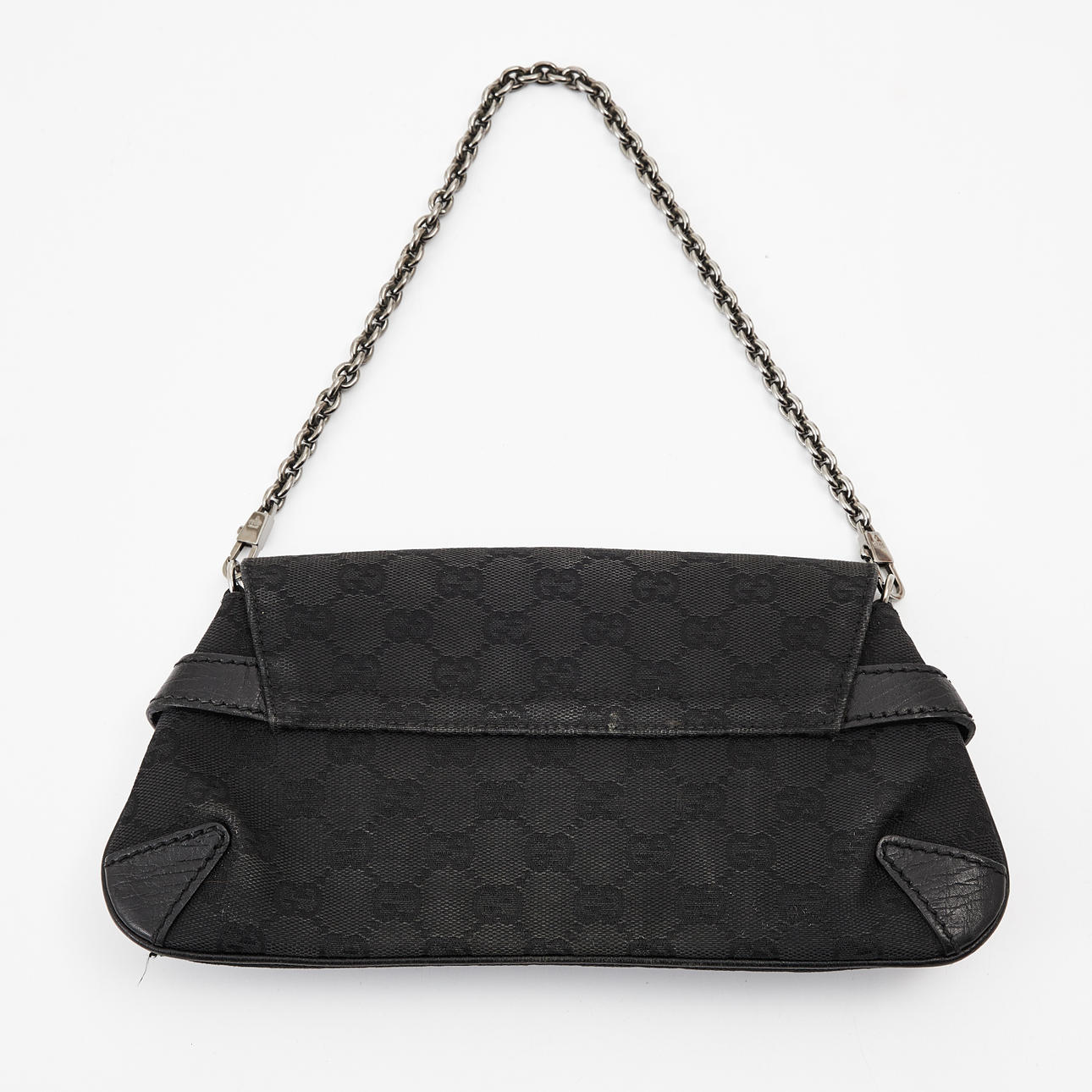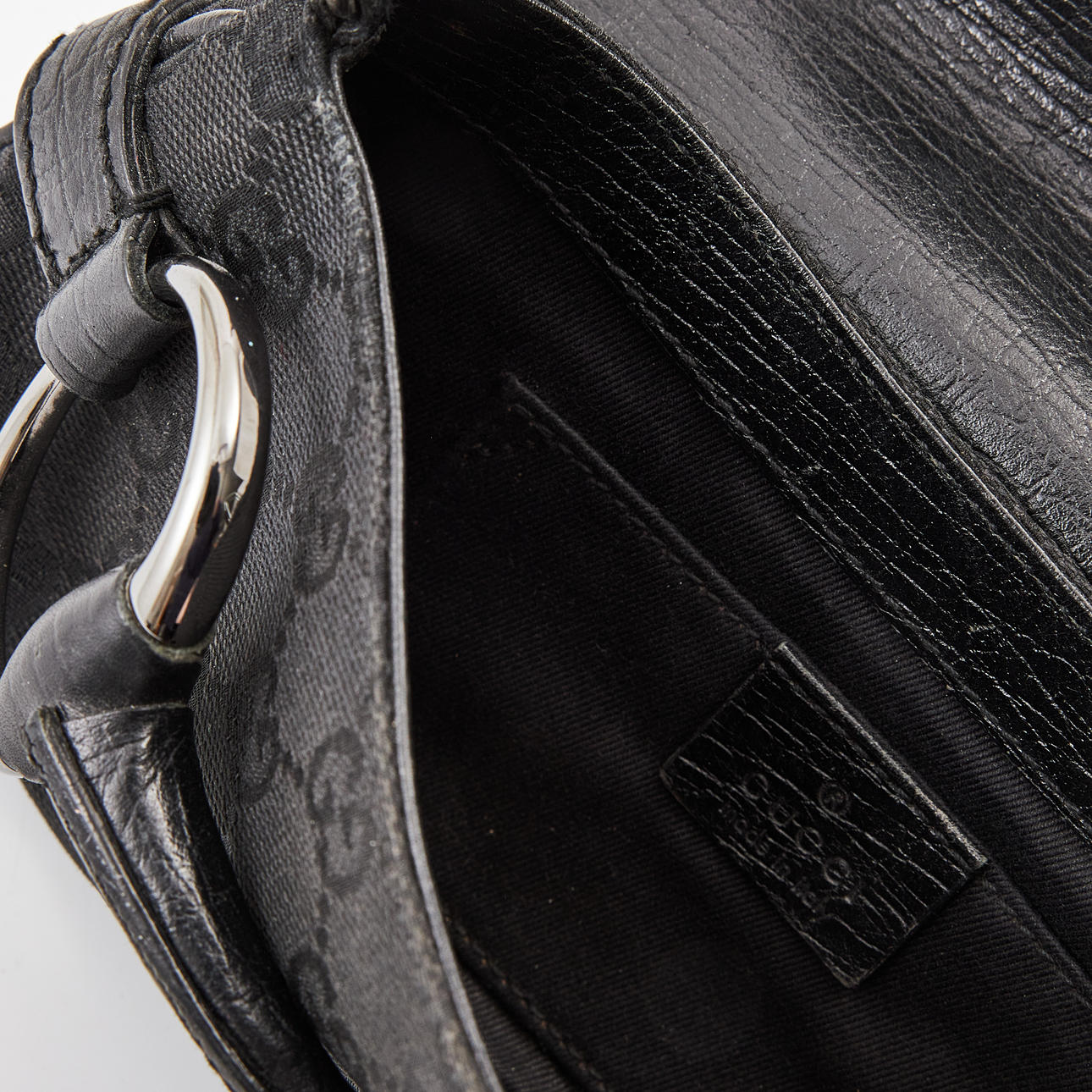 Svart monogramcanvas med svarta läderdetaljer och stålfärgad hardware. Invändigt svart tygfoder, ett fack samt mindre sidofack. Etikettmärkt "GUCCI made in italy" samt med serial code. 26 x 14 cm.