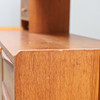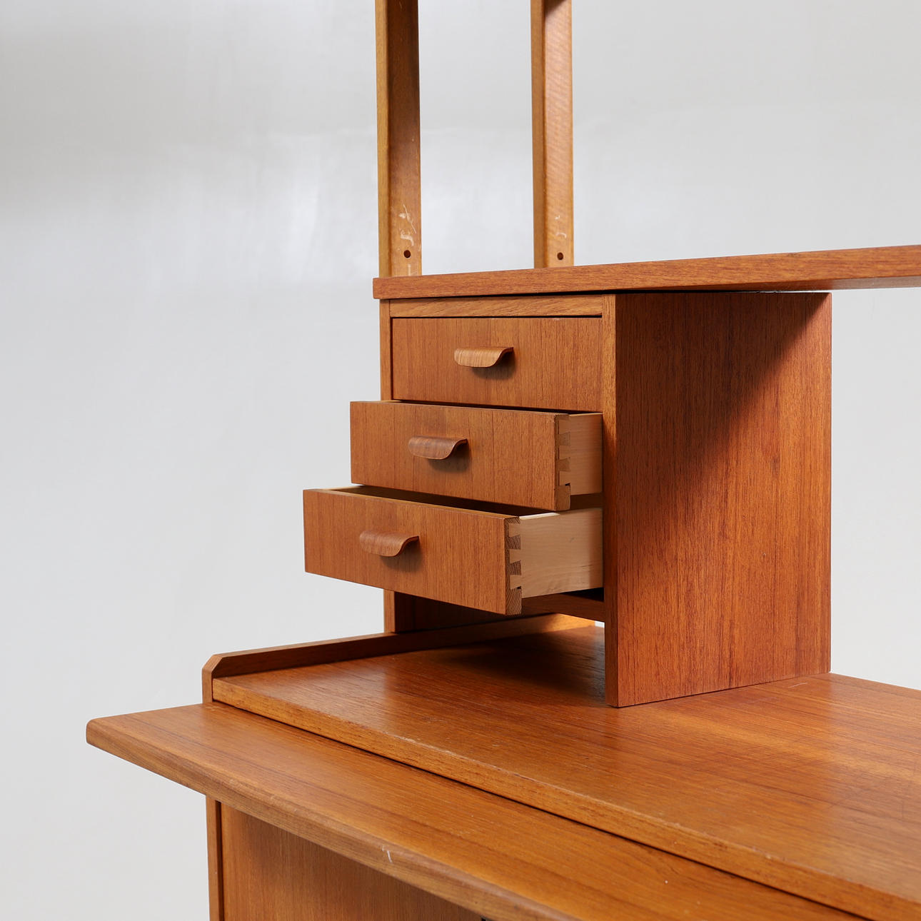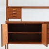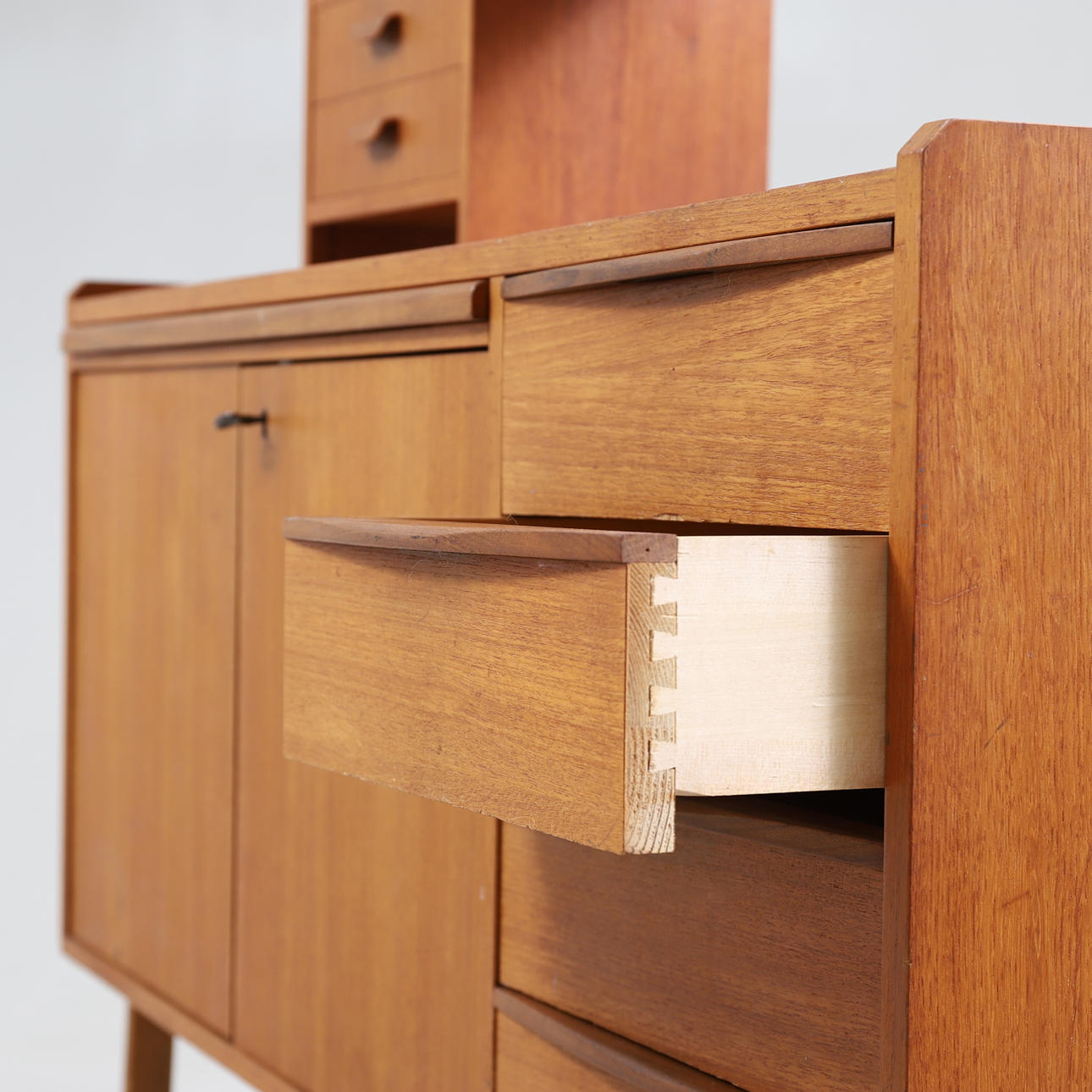 Fanerad i teak, överdel med flyttbara hyllplan samt mindre lådinsatser, nederdel med skåp,