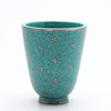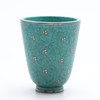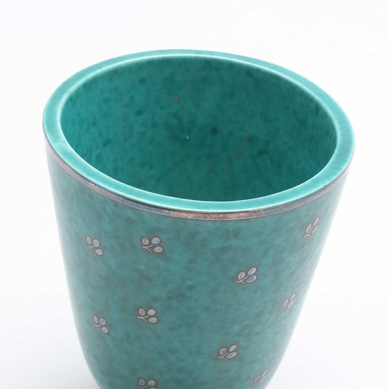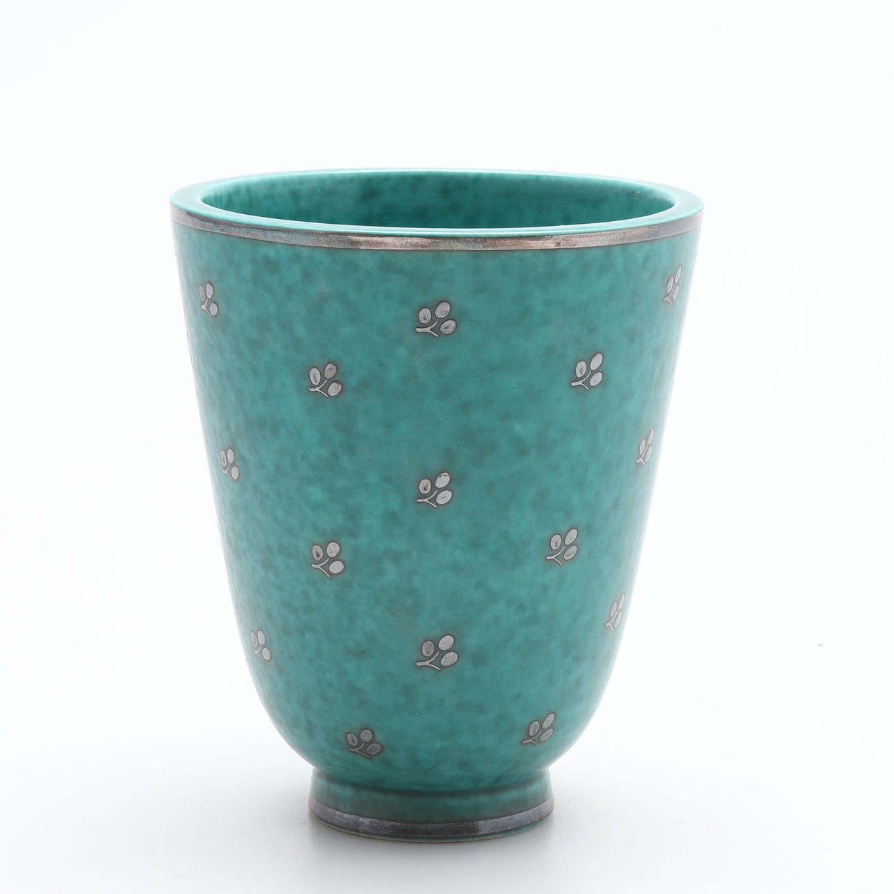 Grönglaserat stengods med silverdekor. Höjd 15 cm.