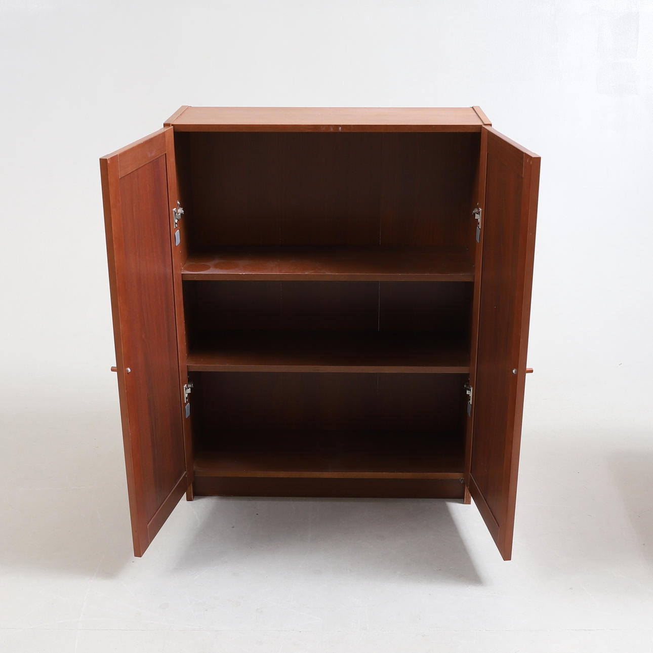 Fanerad. Ett dörrpar med bakomvarande ställbara hyllplan. Bredd ca 80 cm. Djup ca 30 cm. Höjd ca 106 cm.