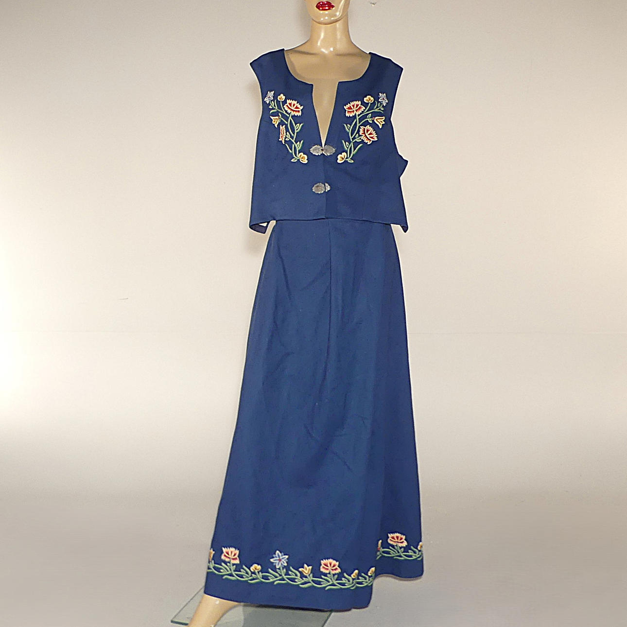 Längd från axel 145 cm, upplägg 4,5 cm. Midjemått ca 49 cm, omlott 15 cm. Mått tagna med plagget liggande plant.