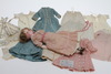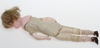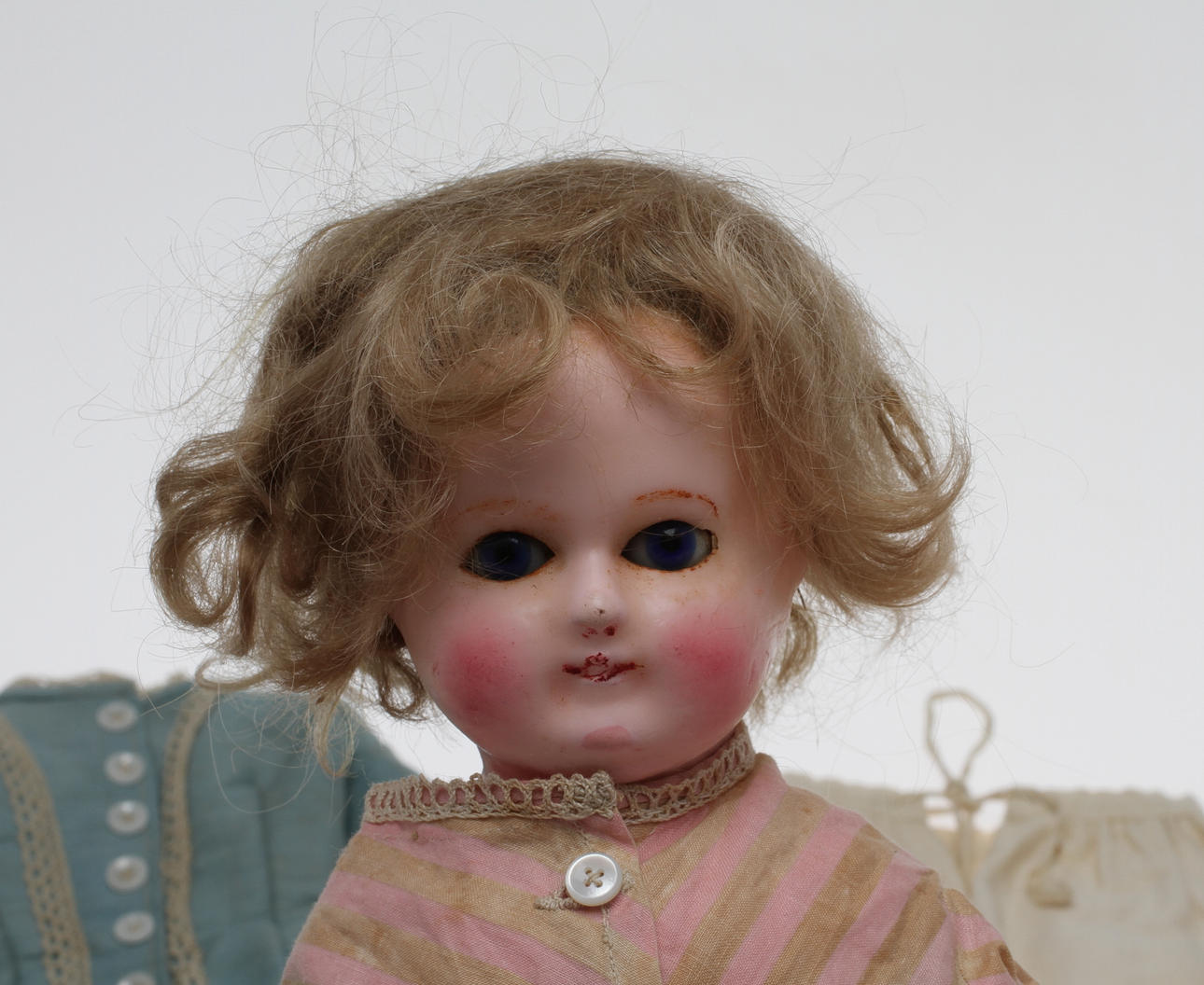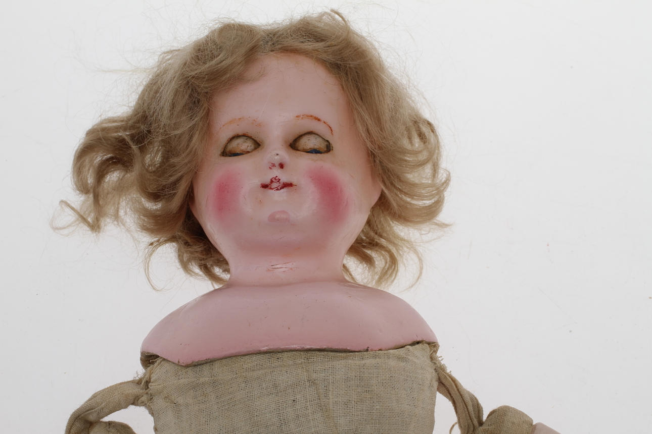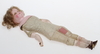 Huvud på sköld , vaxad yta, stoppad kropp och delvis ben. Vader och underarmar vaxad yta. Blå ögon i glas. Parti äldre kläder medföljer.