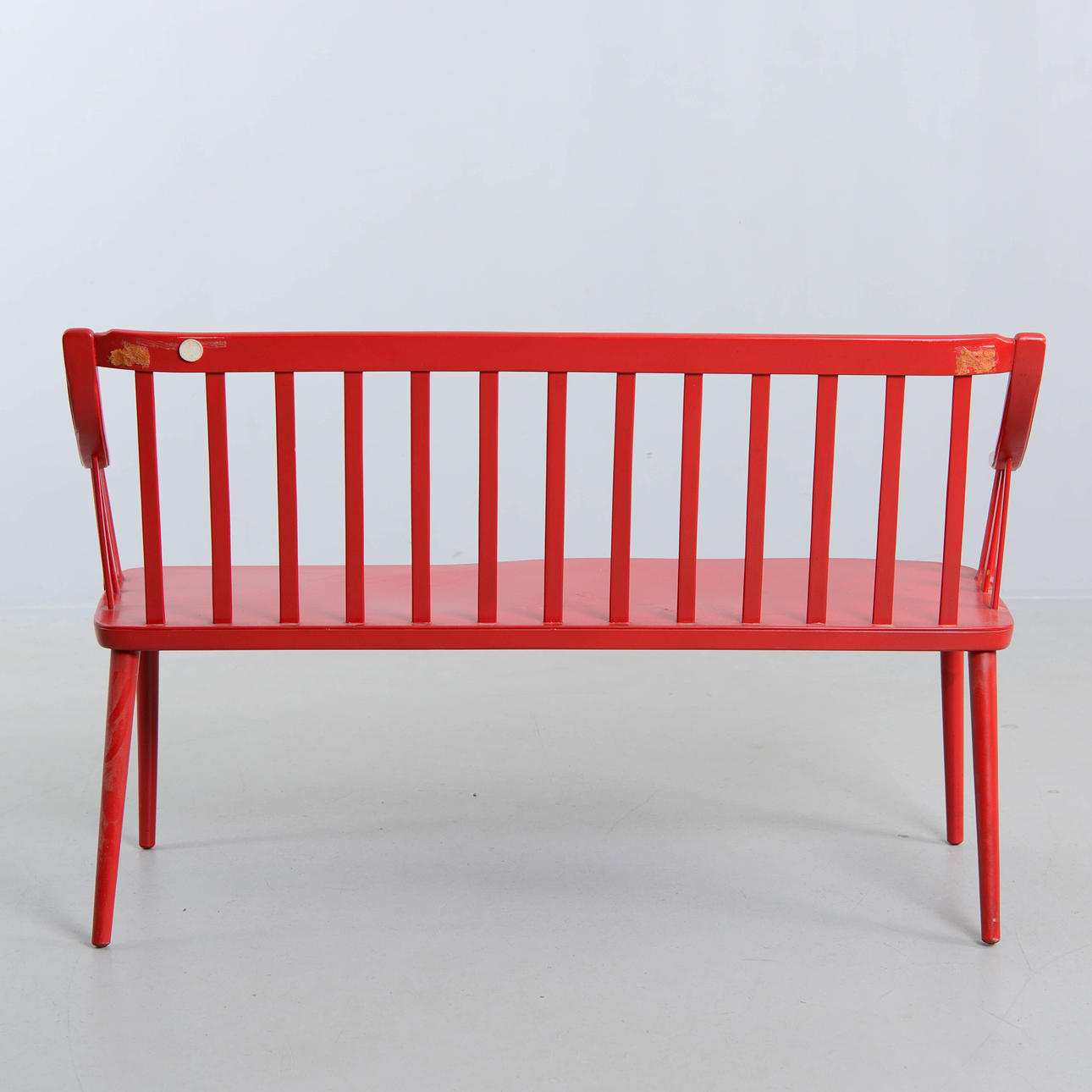 Klisterrester på baksidan. Krackelering i lacken. Limsläpp mellan sits och ram.
