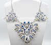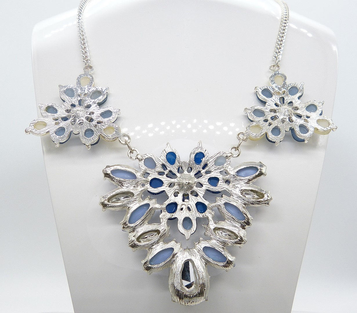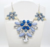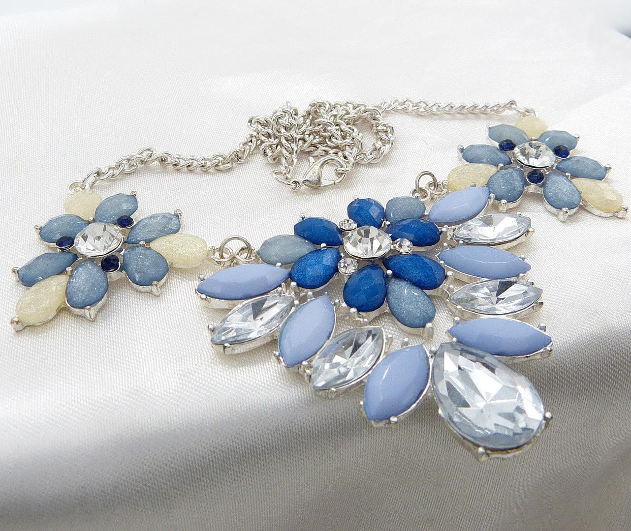 Halsband - En blommig design av lila, blå och klara ädelstenar satt på en vit metallomgivning och hängde på en länkad vit metallkedja