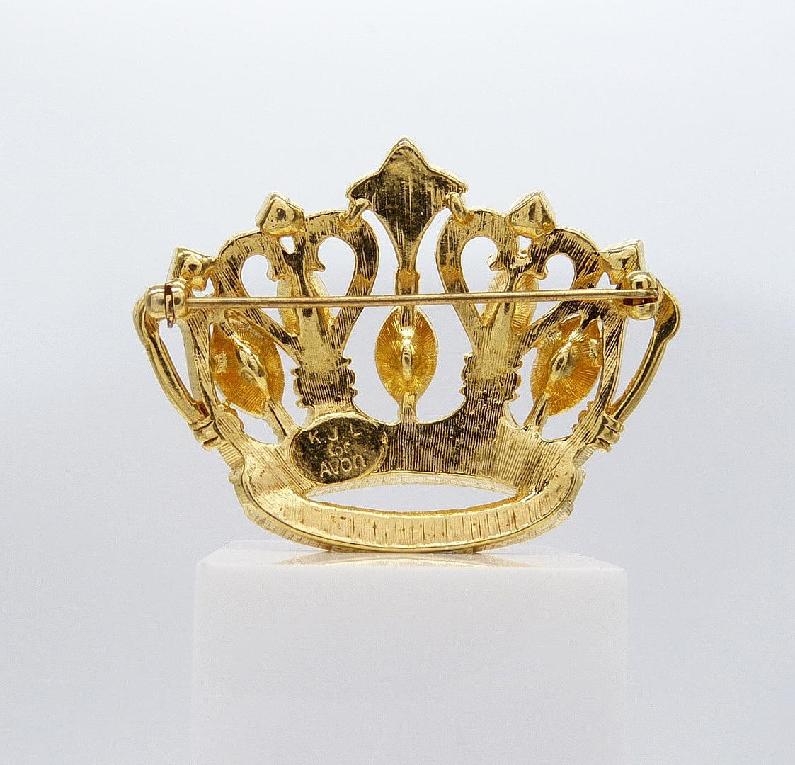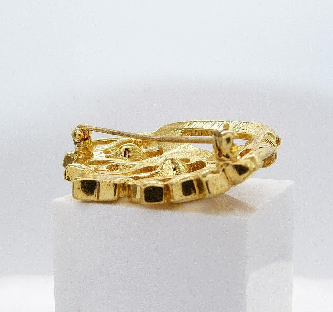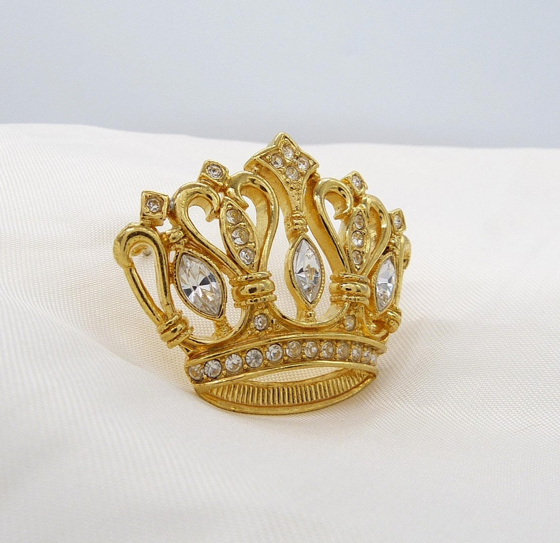 Brosch 1 - Guldfärgad kronbroschuppsättning med klara stenar och på en guldfärgad metallomgivning