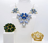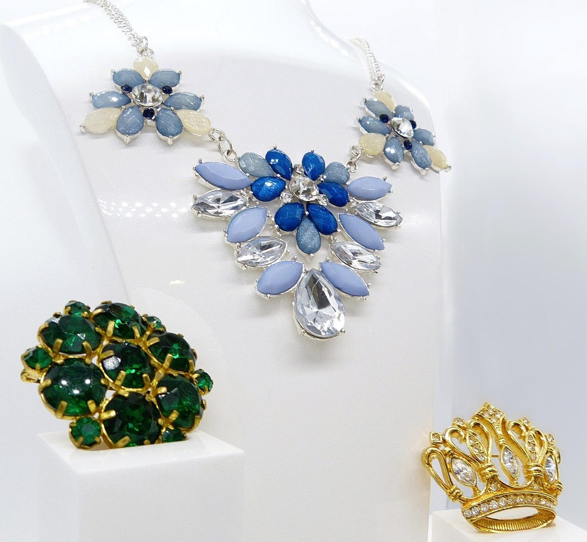 En fin samling av vintage kostymsmycken bestående av ett stort utsmyckat blommönster halsband och två broscher