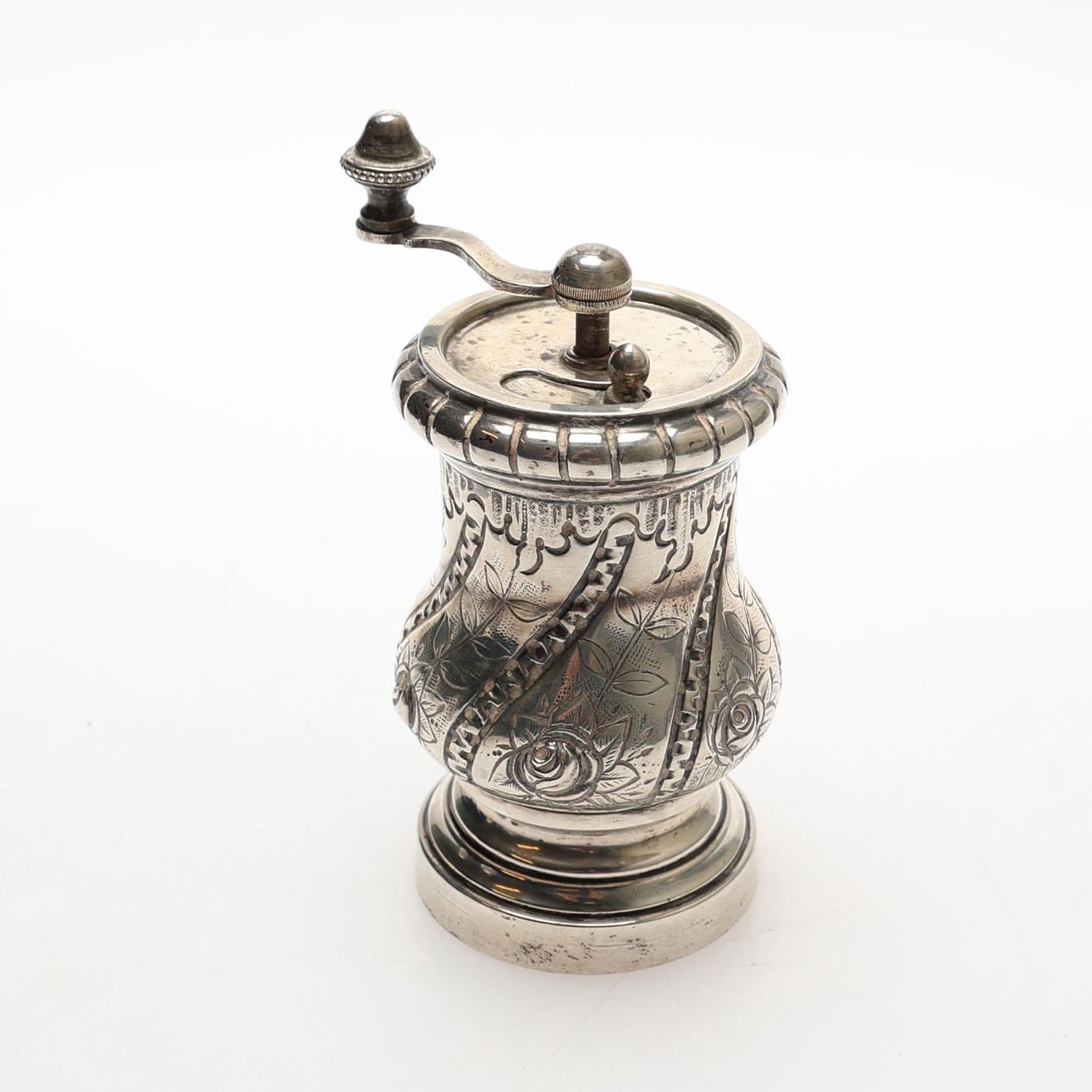 Pepparkvarn med stålinslag. Vikt utan glasinsats ca 386,2 gram. Totalvikt ca 439,4 gram.