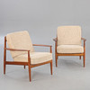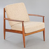 Teakträ, lösa kuddar täckta med beige ulltyg.