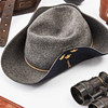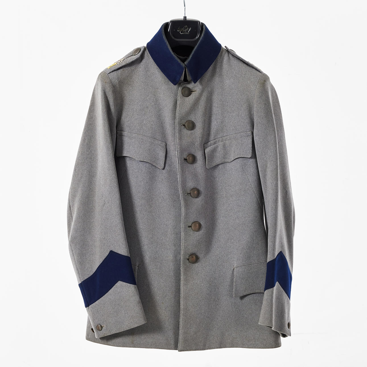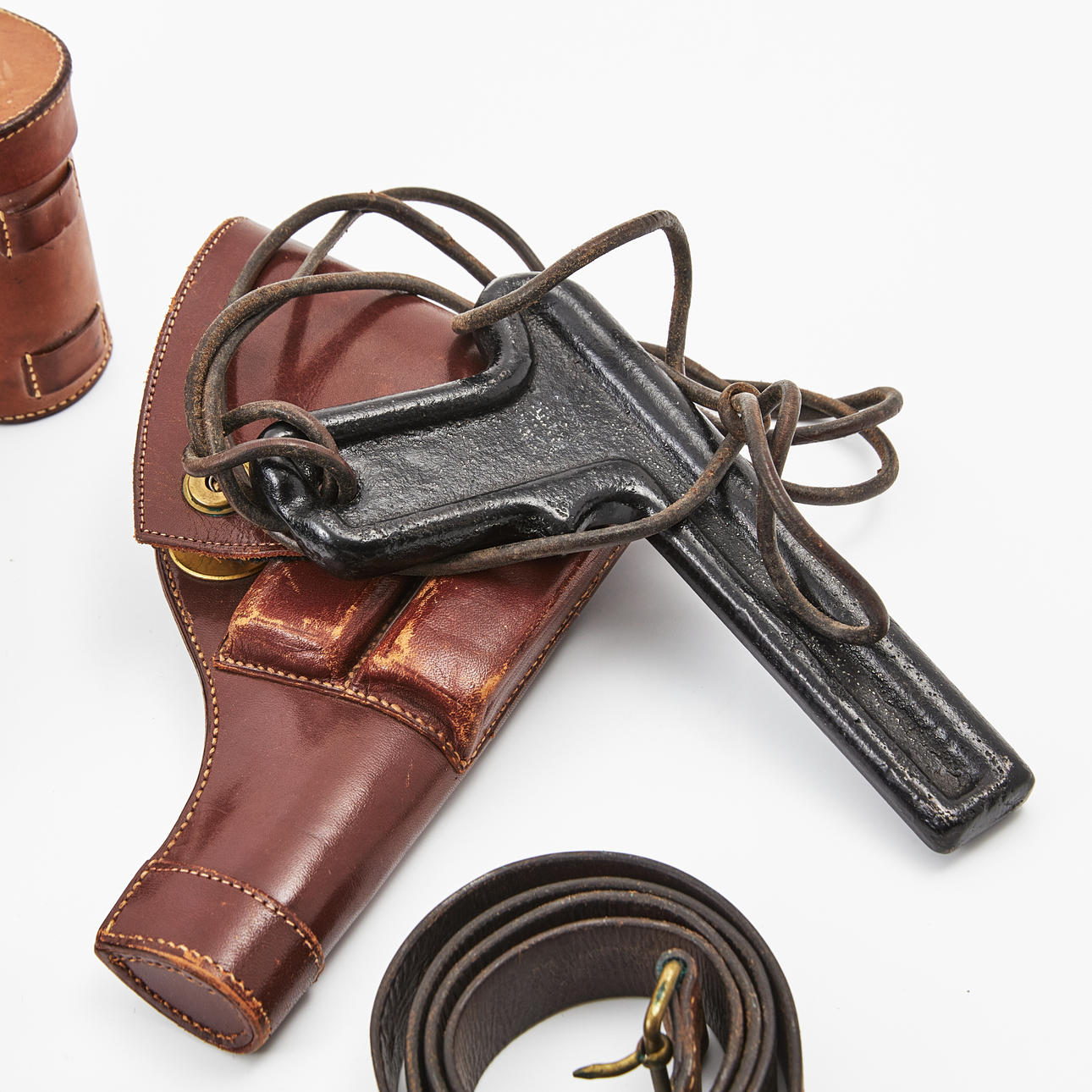 Vapenrock, byxor, rock, hatt, kikare i fodral märkt 1912, pistolhölster med gjutjärnsatrap, ammunitionsväska, läderfodral med glasplunta, 2 bälten vara ett med bärläder.