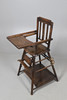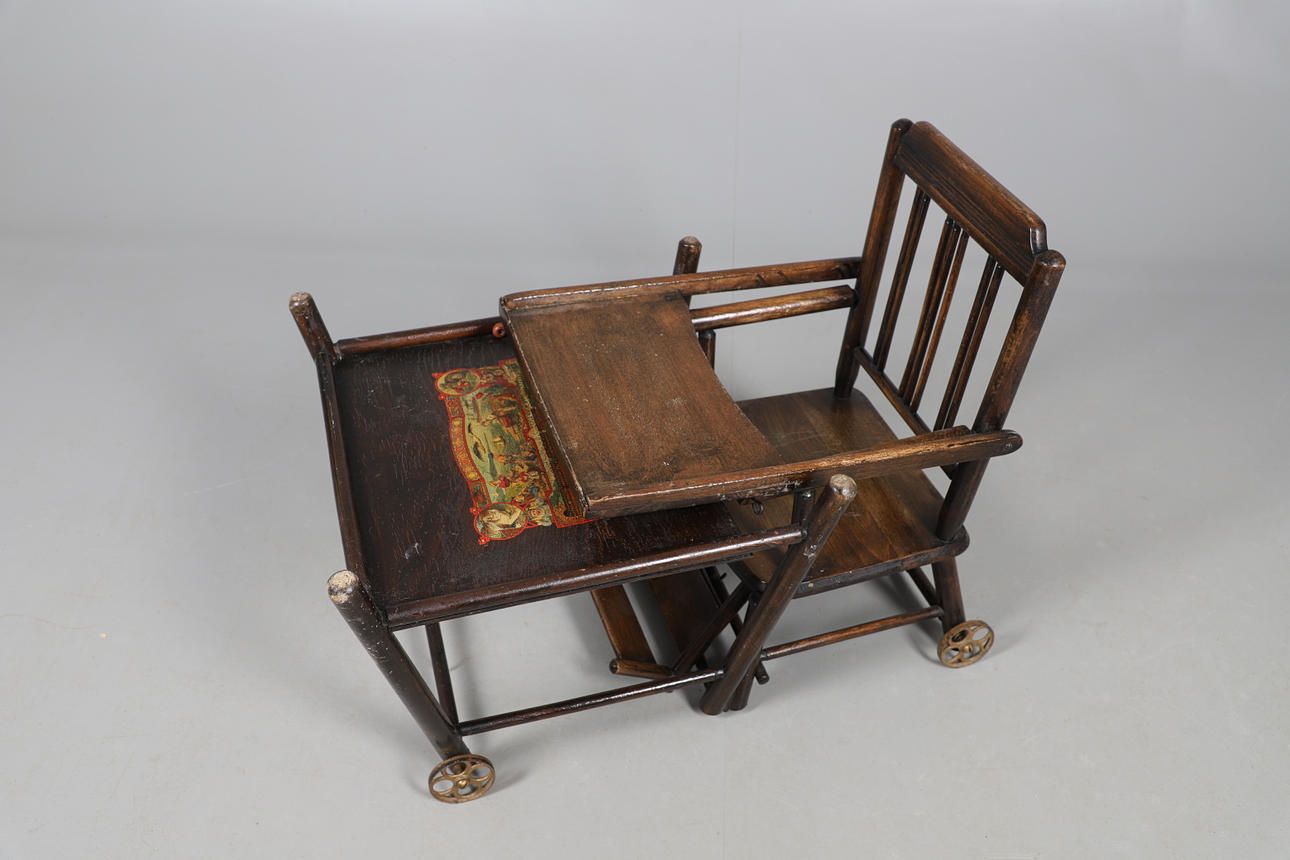 En vintage metamorf barnstol, troligen gjord i bok med fäst bricka och fällbart säte frigjort av en spärr på baksidan. 94cms hög.