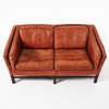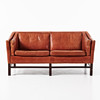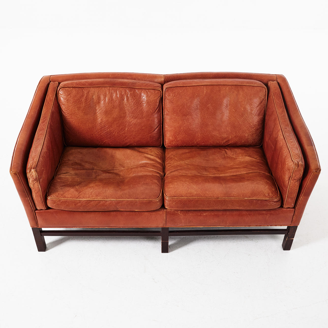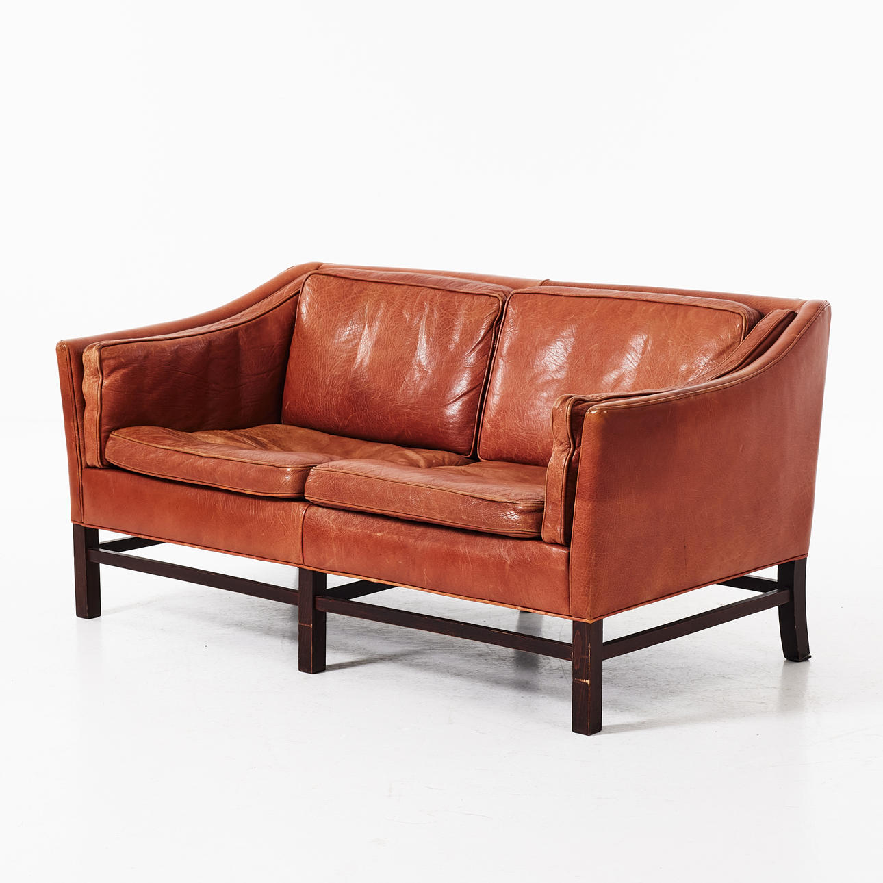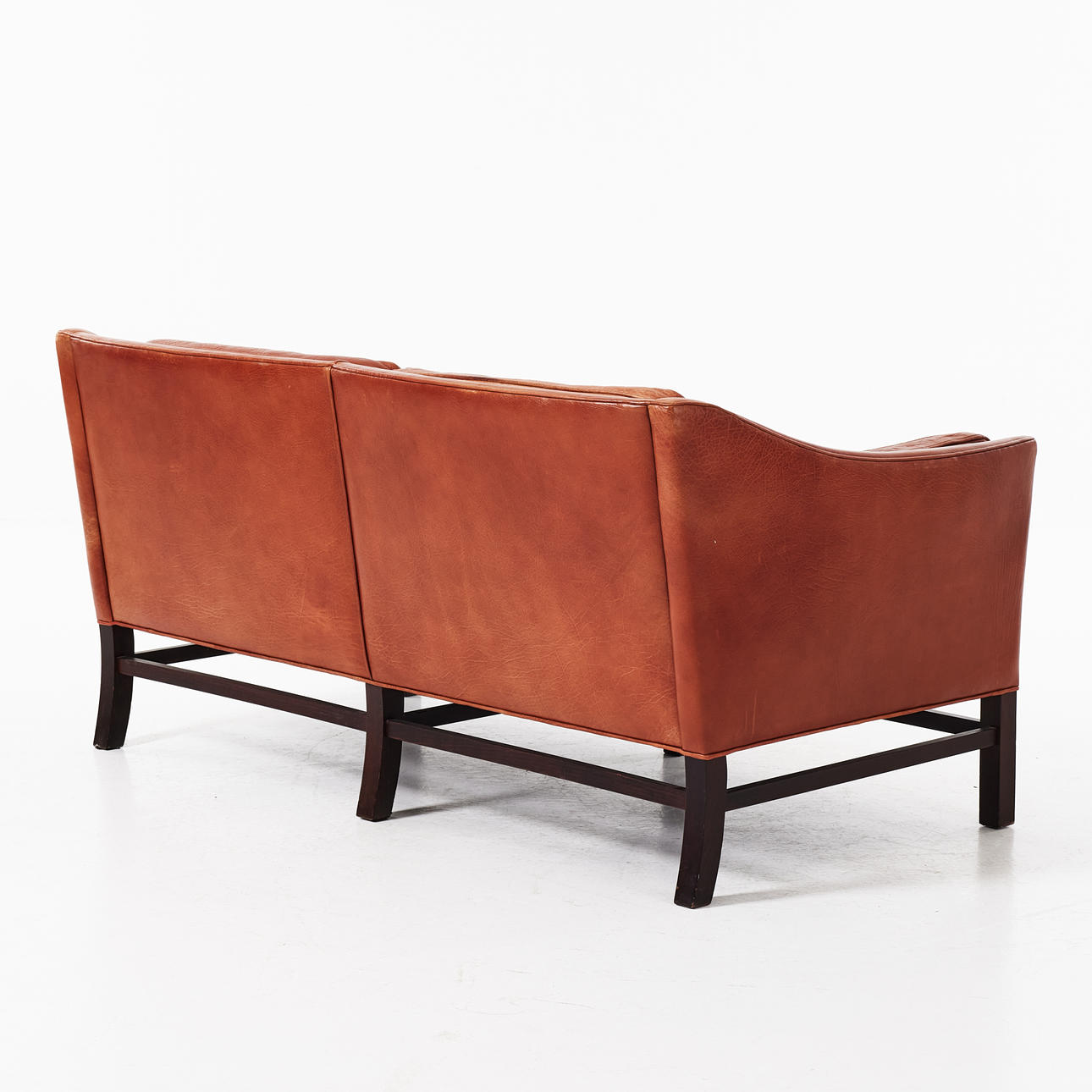 Benställning i brunbetsat trä, lösa sitt och ryggdynor, klädda i skinn. Sitthöjd 42, höjd 71, längd 155 cm.
