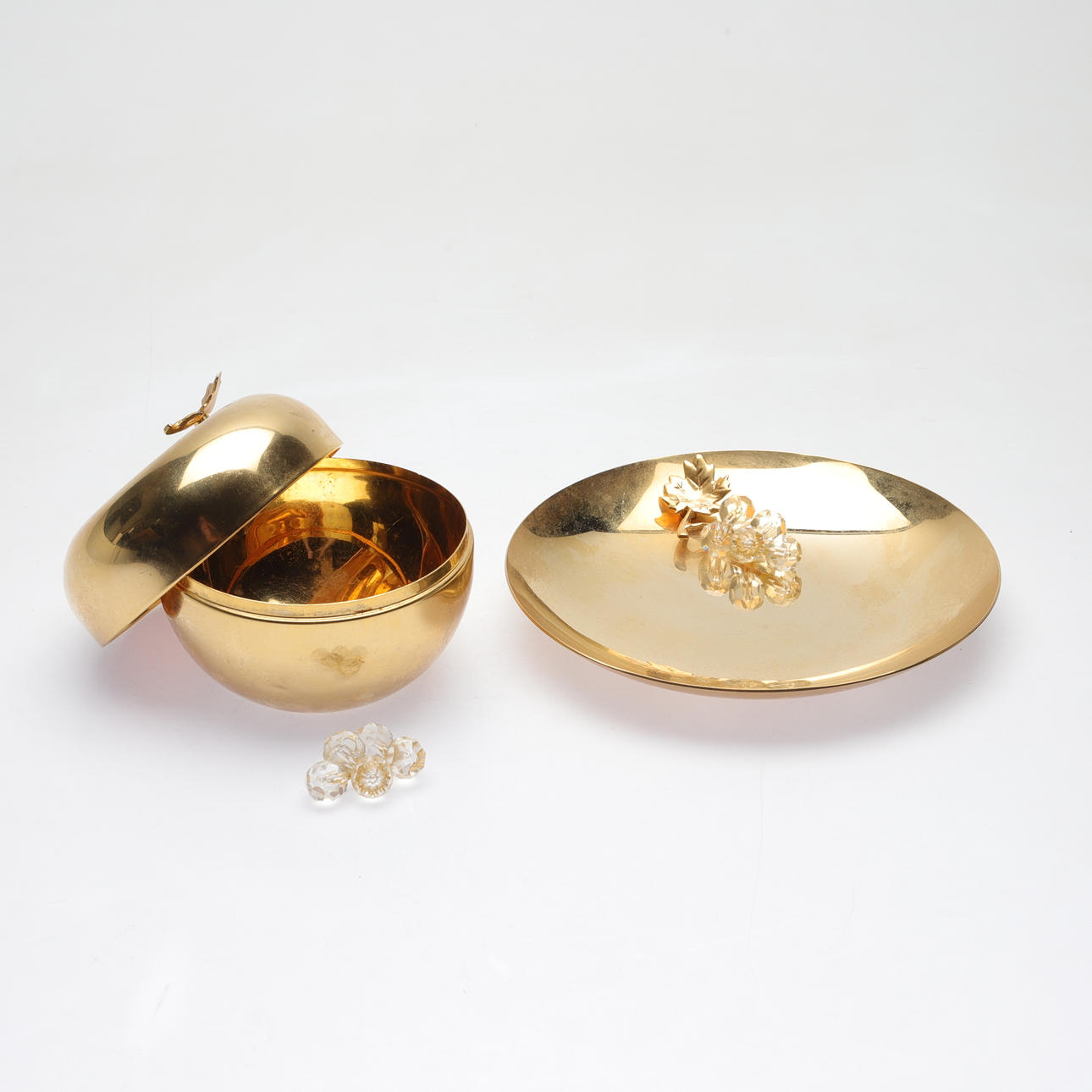 1 par hänkelvaser, höjd ca 18,5 cm, 1 par dekorationsvaser, höjd ca 17,5 cm. 1 lockskål, höjd ca 11 cm. 1 fat, diameter ca 18 cm.