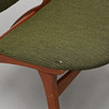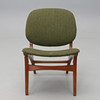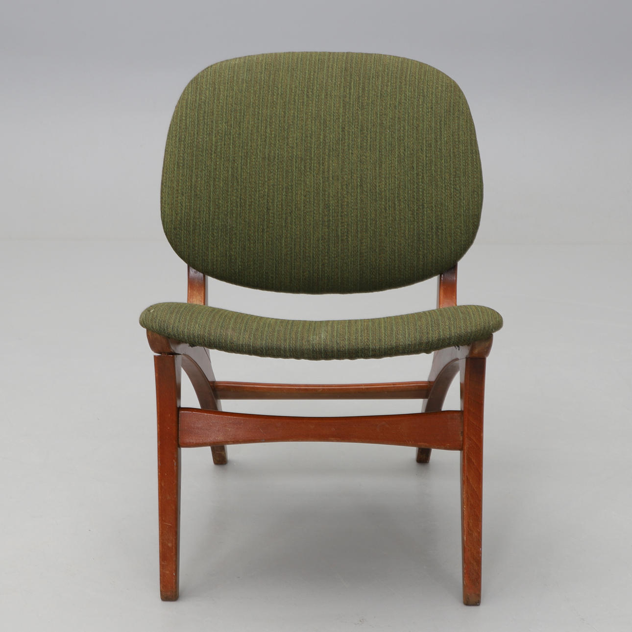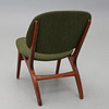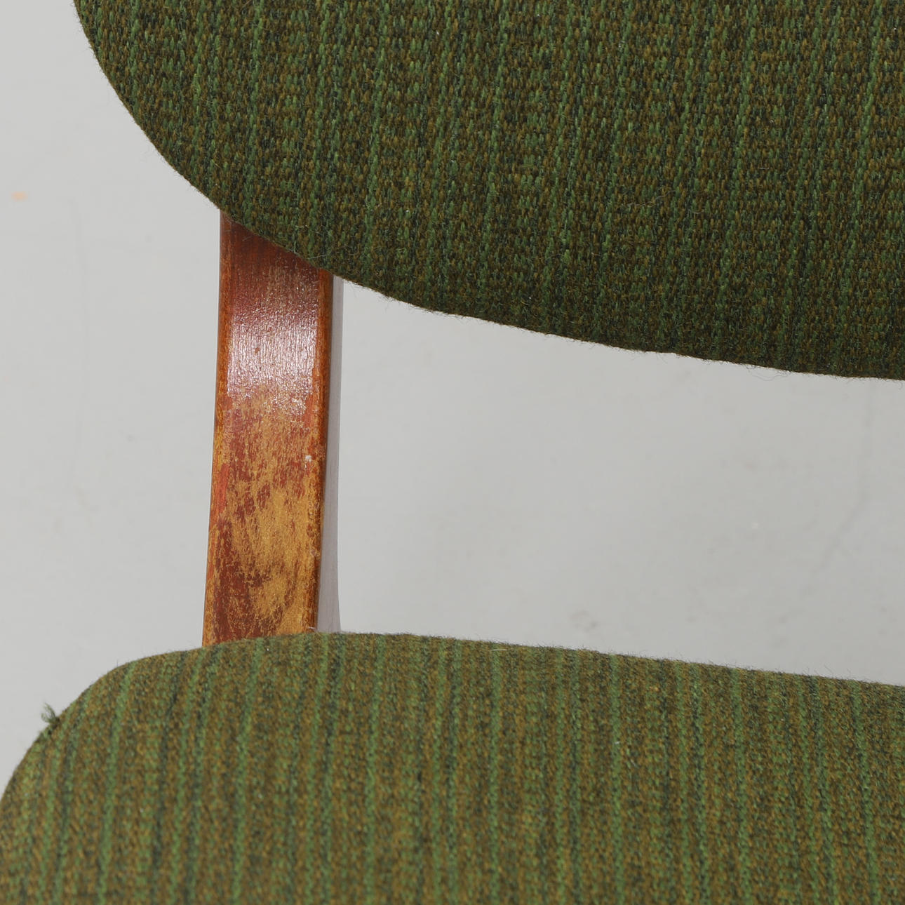 Stomme av betsad bok. Fast stoppad och textilklädd sits och rygg. Bredd 52, djup 68, rygghöjd 73, sitthöjd 40 cm.
